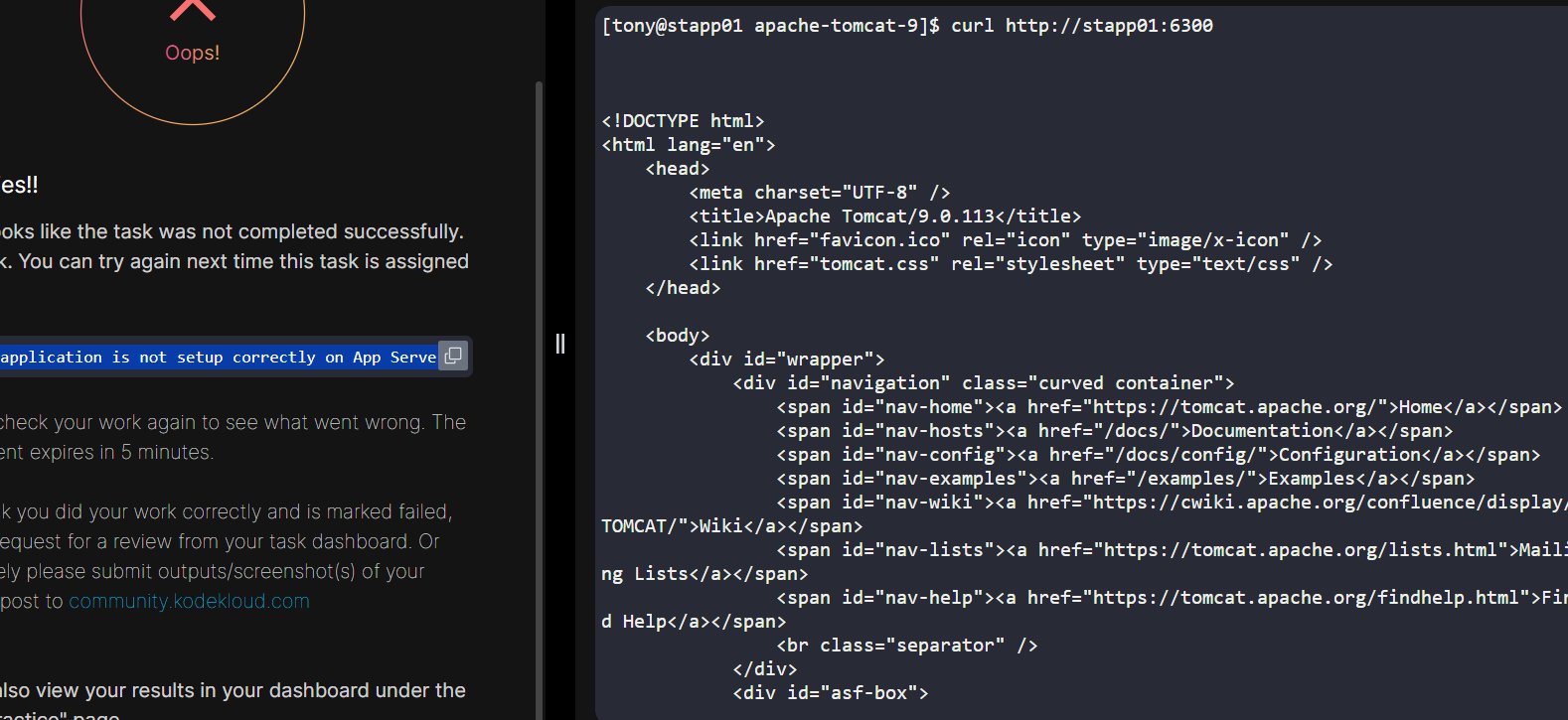 I could able to reach the newly installed Tomcat server on mentioned port, but yet i got feedback as i failed to solve the task. can you guys please look and help me see correctly?