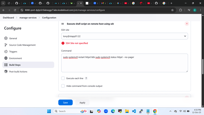 Automation Failure: Since the Jenkins job is running the script non-interactively over SSH, it never sends the required ‘q’ input. The script therefore hangs indefinitely on the first server’s build step, preventing the pipeline from moving on to the commands for stapp02 and stapp03.