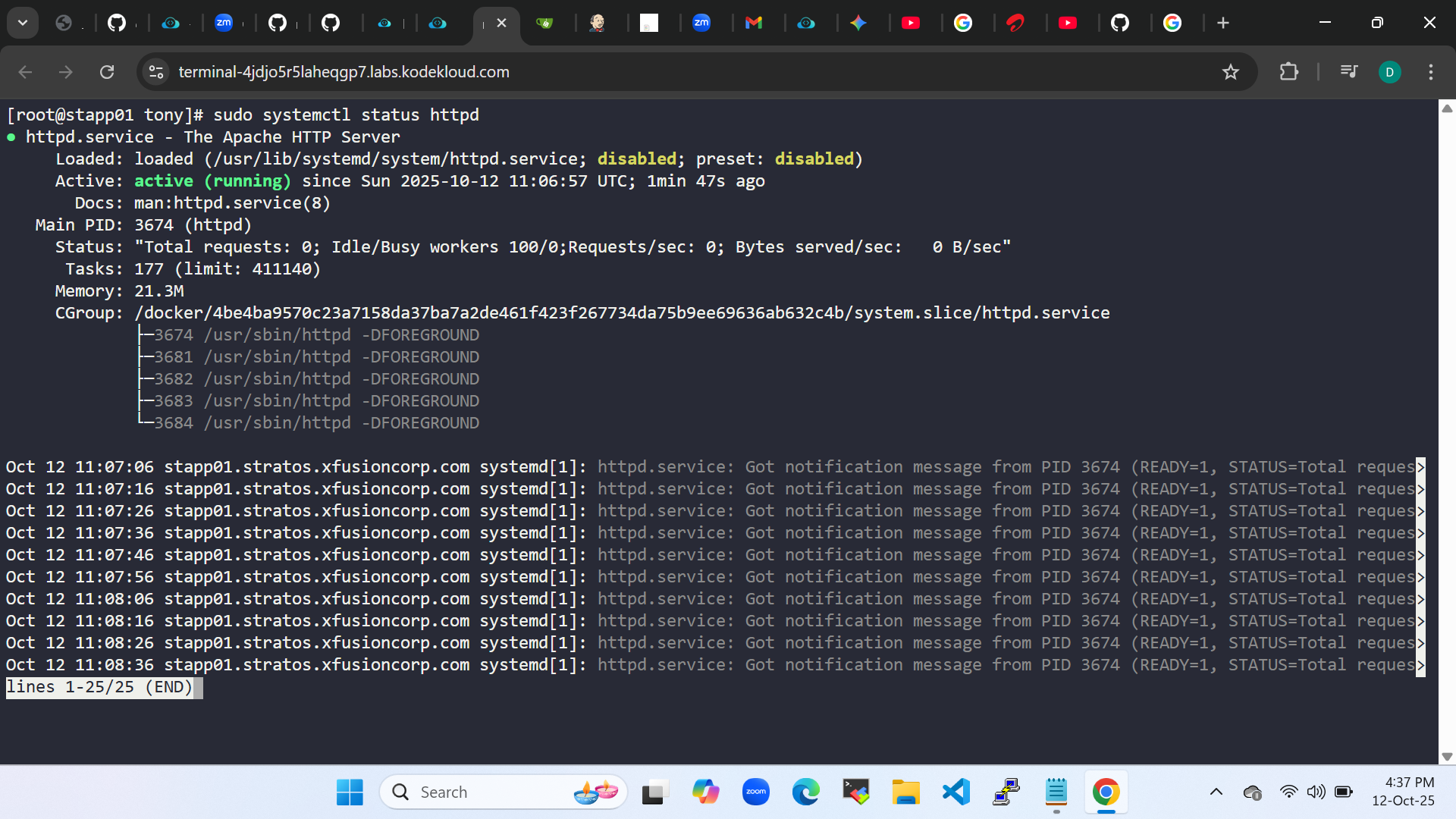 Oct 12 11:07:36 stapp01.stratos.xfusioncorp.com systemd[1]: httpd.service: Got notification message from PID 3674 (READY=1, STATUS=Total reques>
