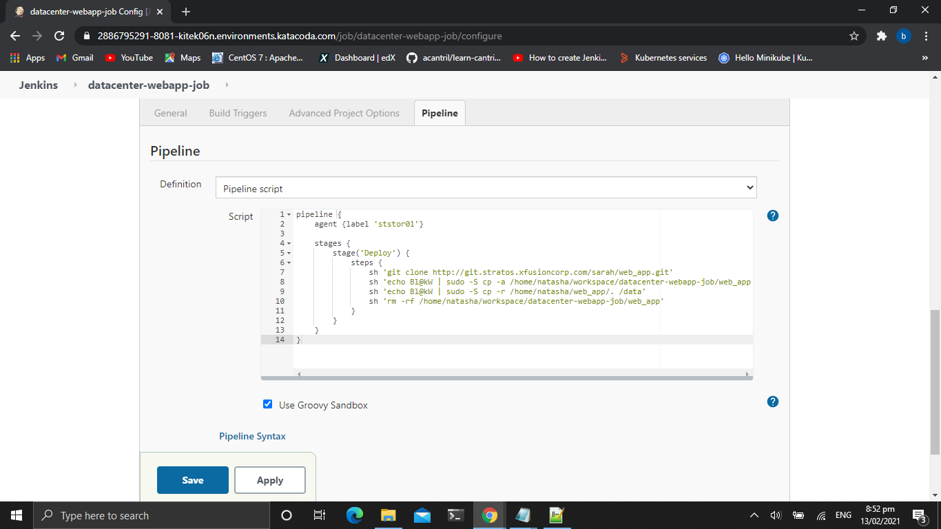 sh 'echo Bl@kW | cp /home/sarah/web_app/* /data/'
