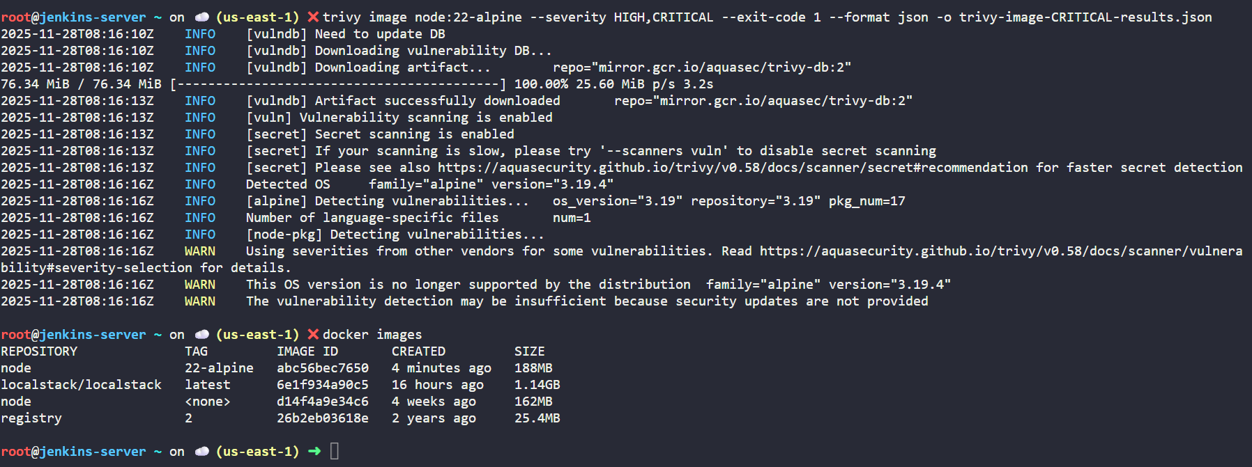 2.) Updated the Dockerfile and the Jenkinsfile (at both the build image and Trivy scan stages) with the node:25-alpine image version. As you suggested I also replaced the --exit-code 1 with --exit-on-eol 22 (an INT integer value is required, so I typed 22). The pipeline succeeded. (Please see the console output from the Jenkins UI attached, please rename it to 2.txt, “.pdf” needs to be removed from the filename)