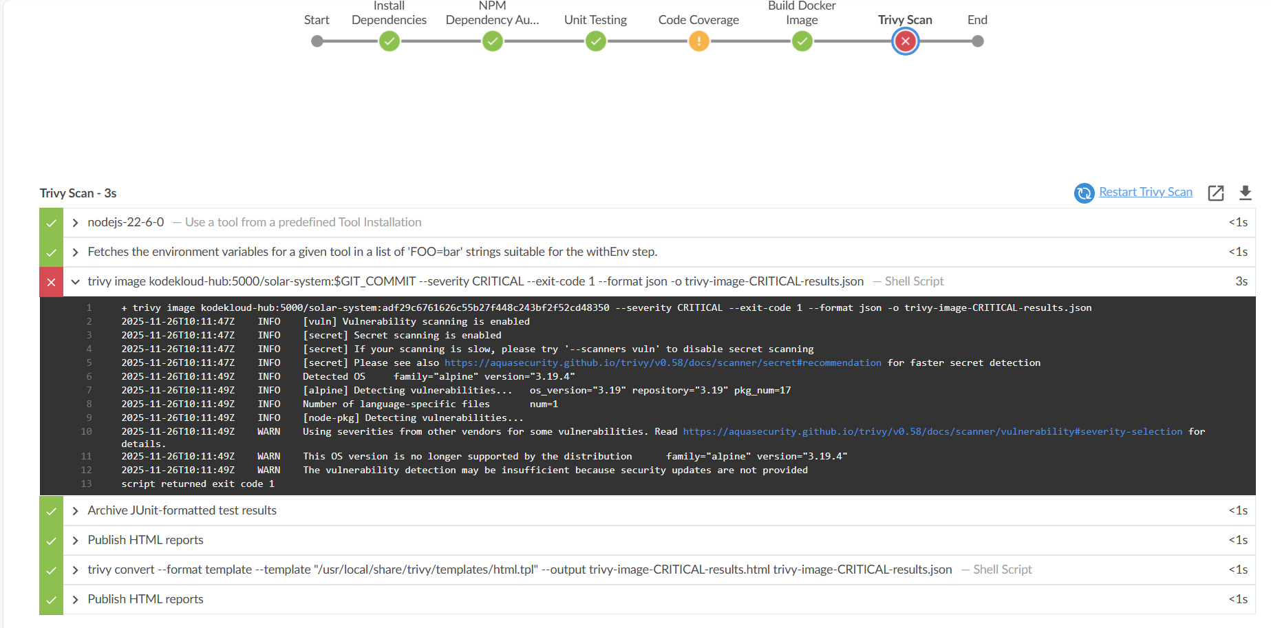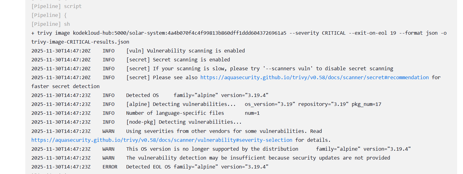 Also ran the step 4 with the original image: kodekloud-hub:5000/solar-system:${GIT_COMMIT} and Trivy scan with --exit-on-eol 19.
