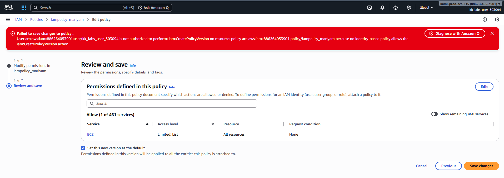 User arn:aws:iam::886264053901:user/kk_labs_user_303094 is not authorized to perform: iam:CreatePolicyVersion on resource: policy arn:aws:iam::886264053901:policy/iampolicy_mariyam because no identity-based policy allows the iam:CreatePolicyVersion action