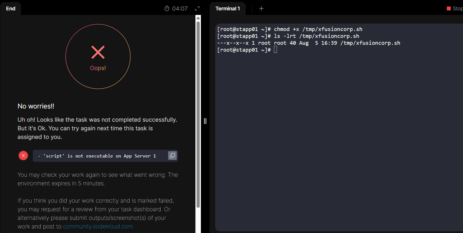 In a bid to automate backup processes, the xFusionCorp Industries sysadmin team has developed a new bash script named xfusioncorp.sh. While the script has been distributed to all necessary servers, it lacks executable permissions on App Server 3 within the Stratos Datacenter.