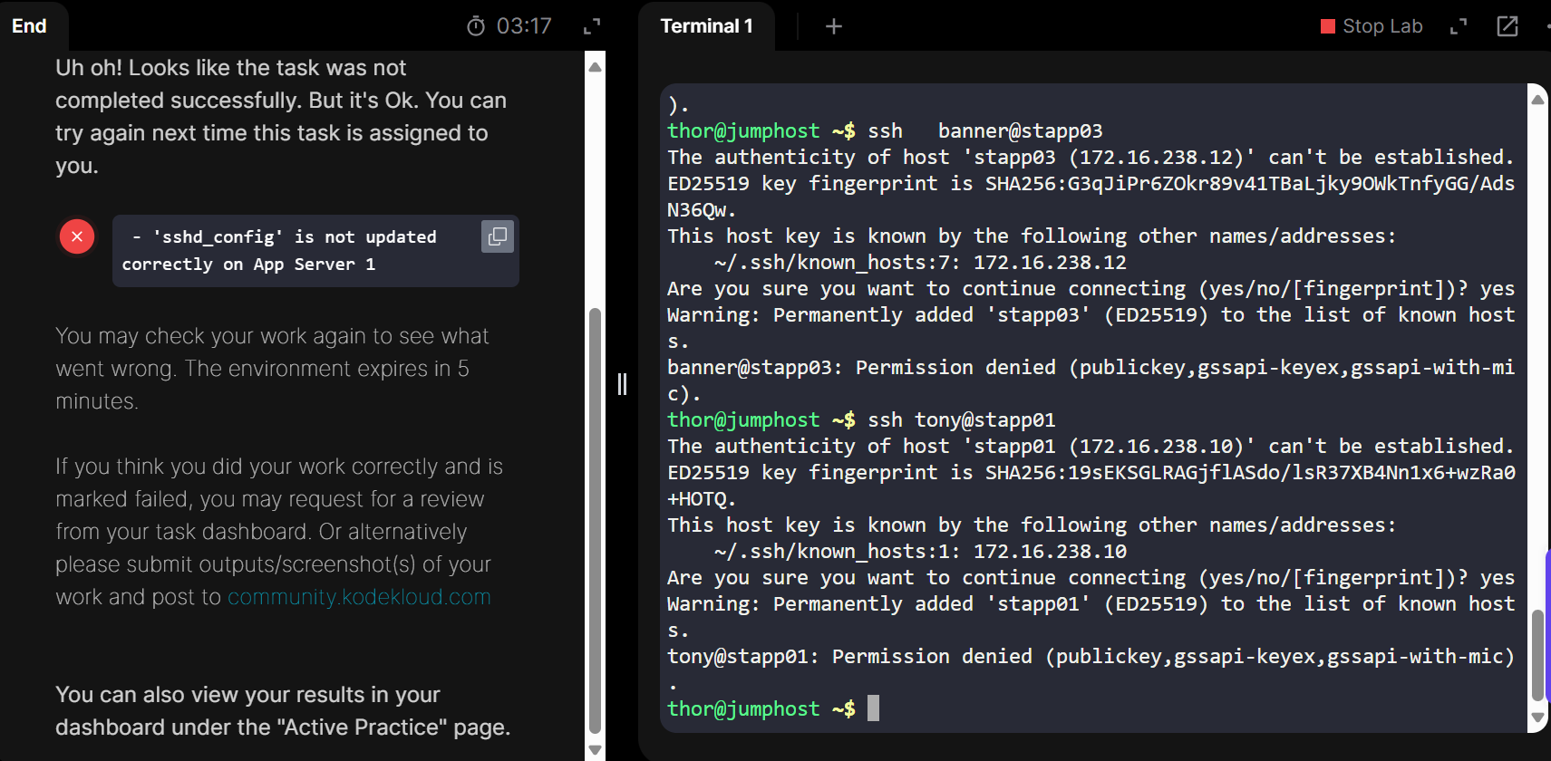 Hello , I have an issue with Task 3 I’m hoping you found your way around it. I got an error that the sshd_config file was not properly edited on App Server 1 however I issued the same permissions on Server 2 and 3 . Can you assist please ?
