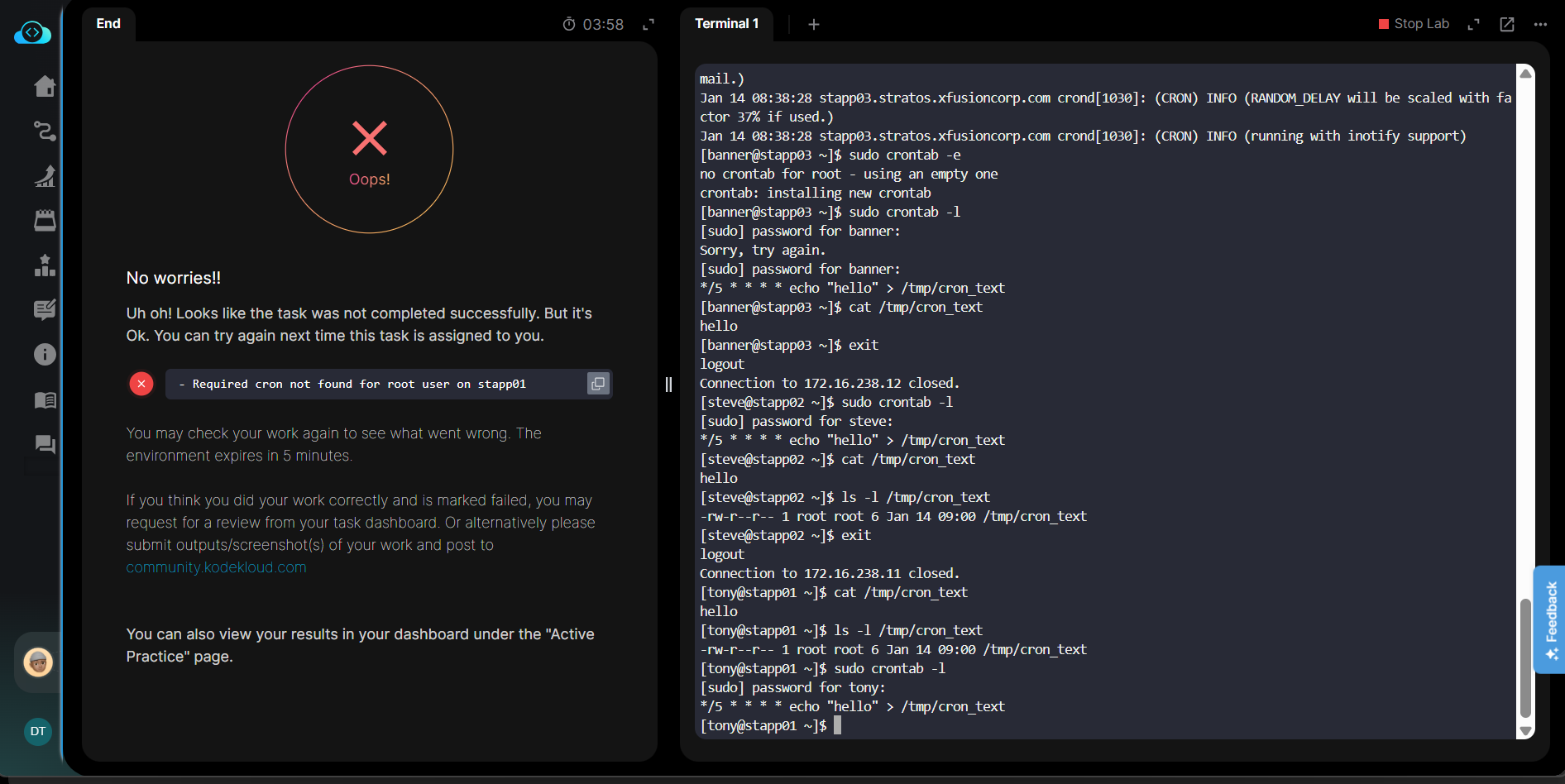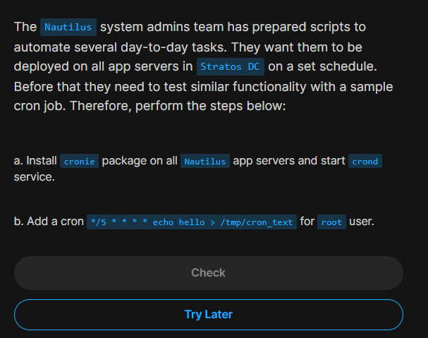 yes i completely agree with you @Santosh_KodeKloud there is a difference between using crontab -e and manually editing in the /etc/crontab file