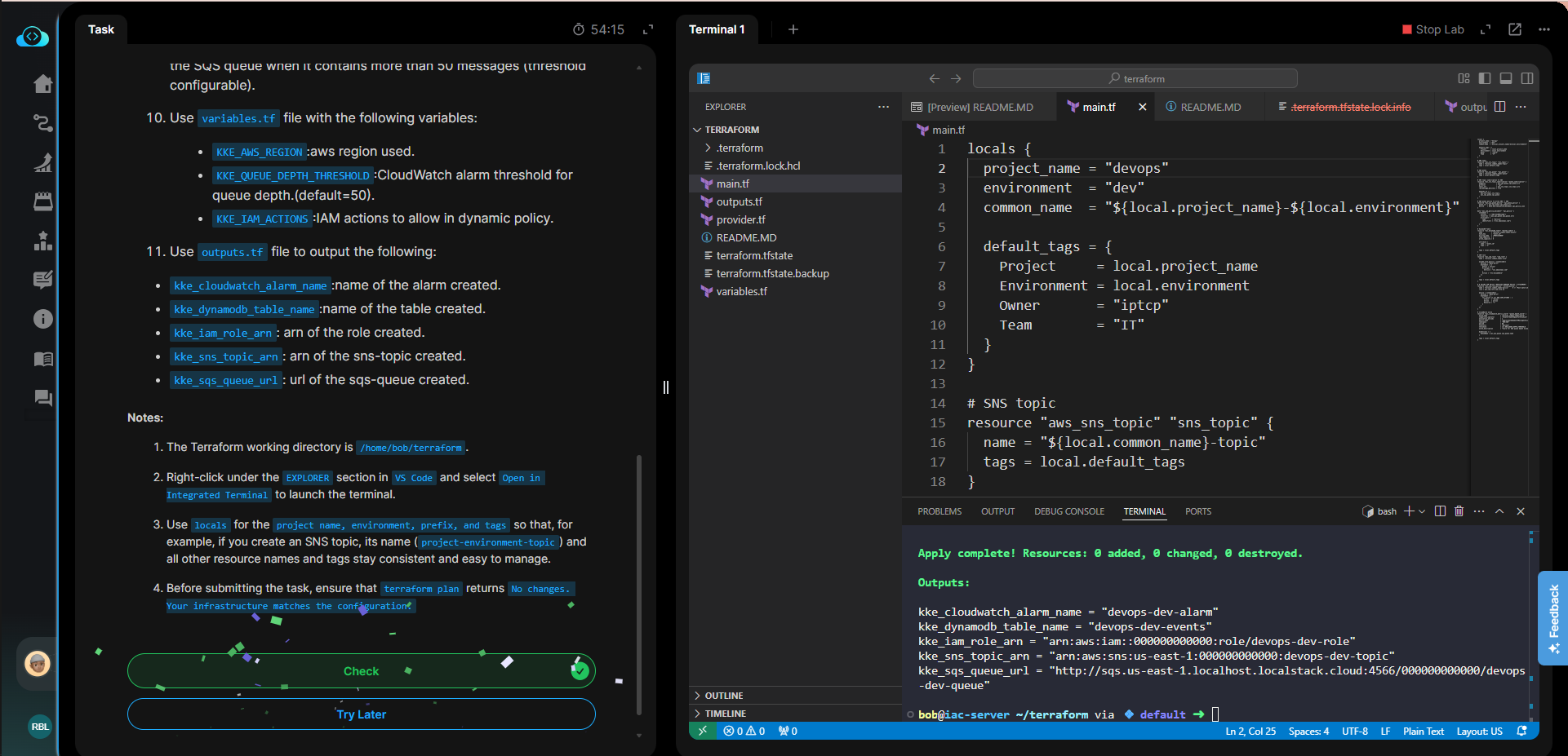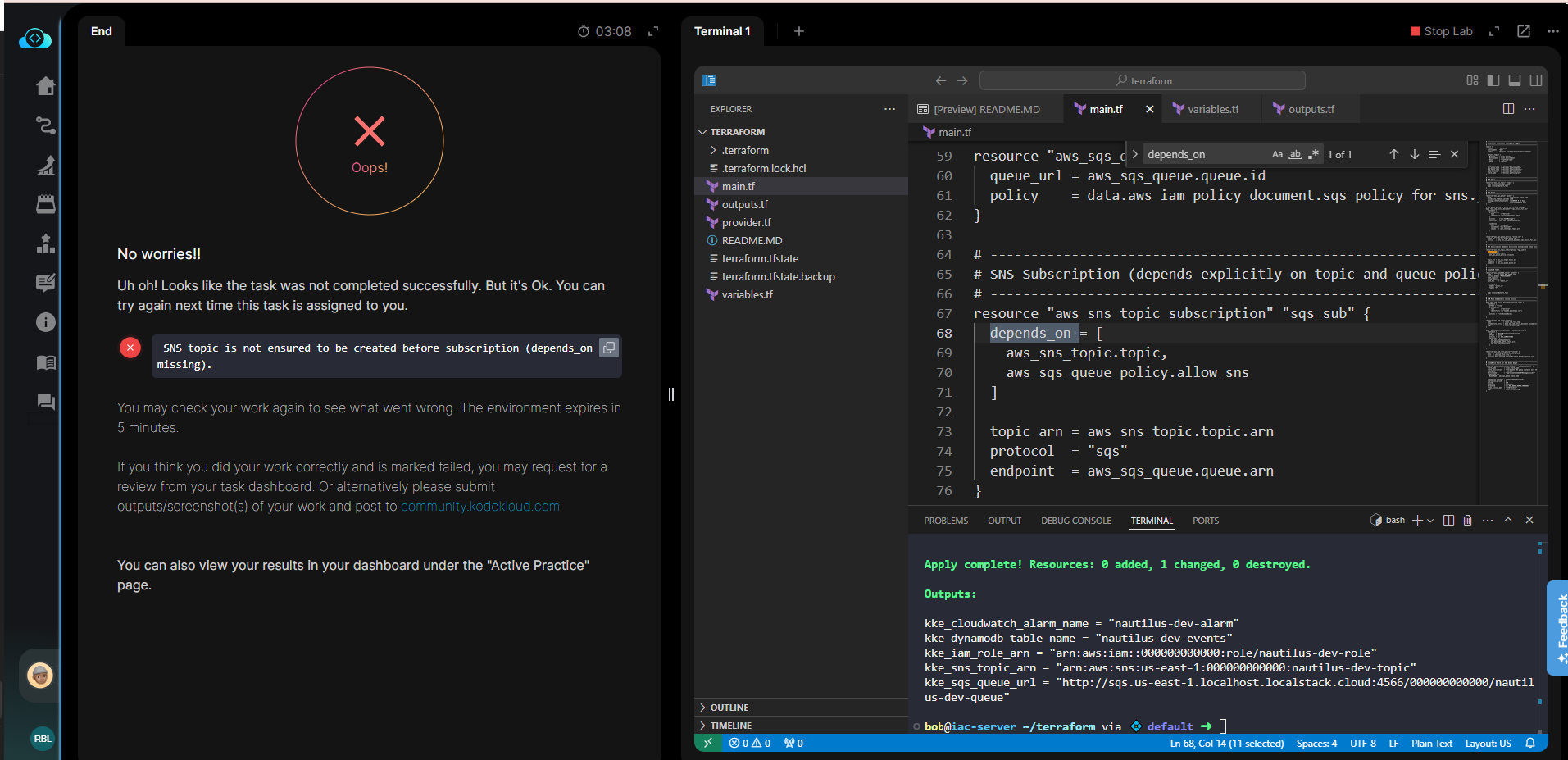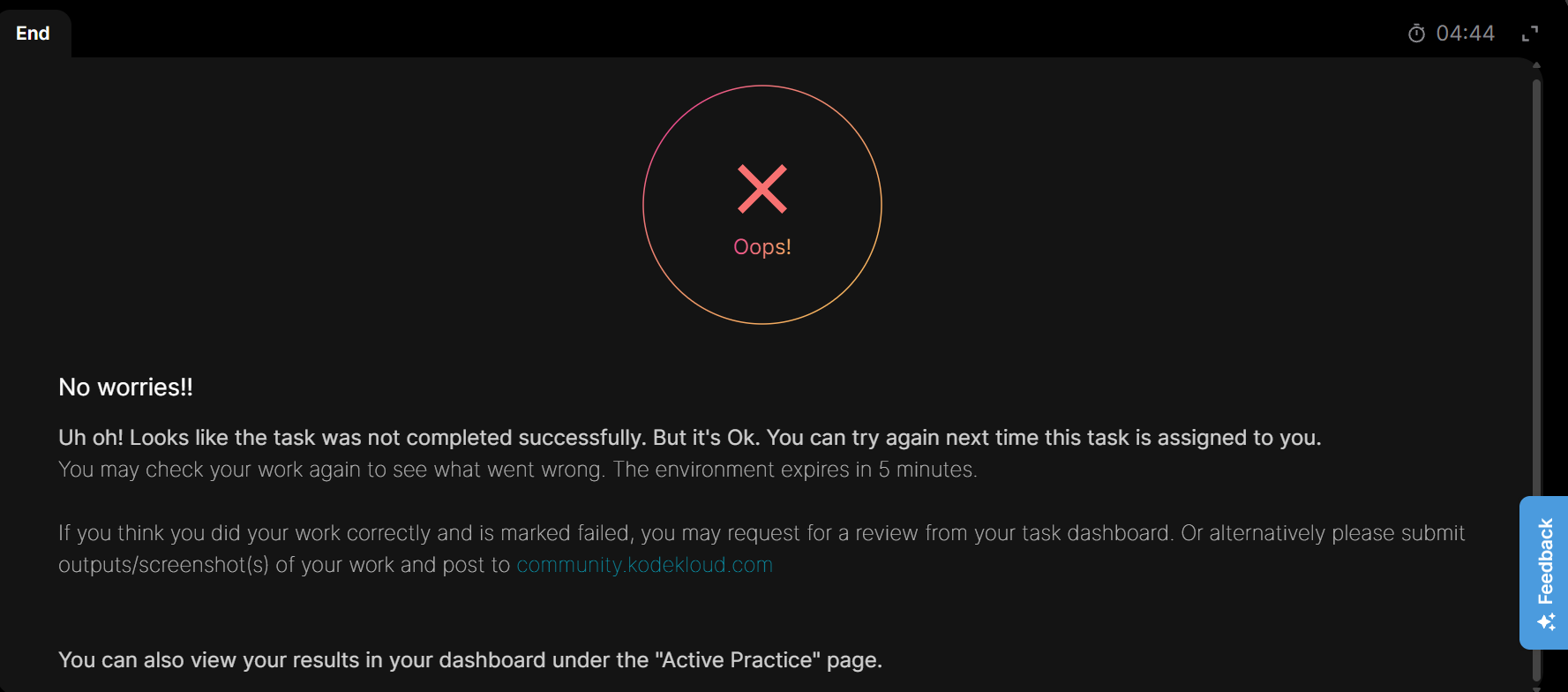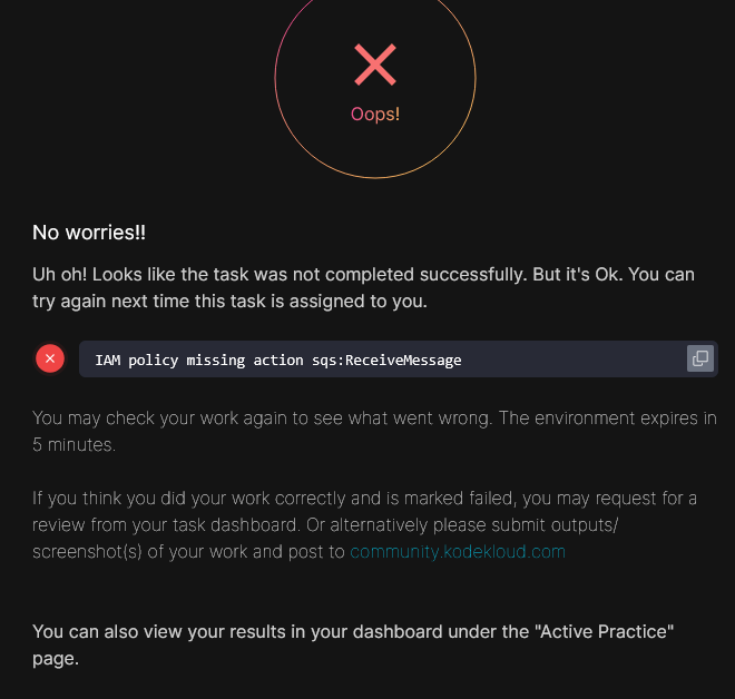 You may check your work again to see what went wrong. The environment expires in 5 minutes.