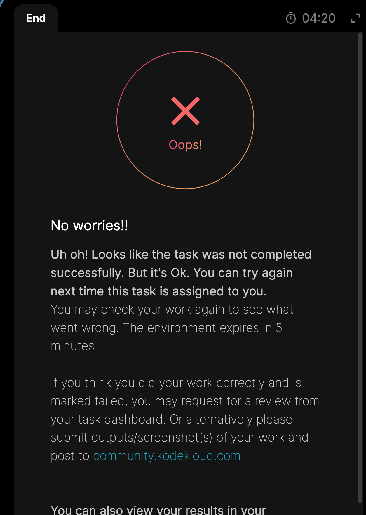 If you think you did your work correctly and is marked failed, you may request for a review from your task dashboard. Or alternatively please submit outputs/screenshot(s) of your work and post to community.kodekloud.com