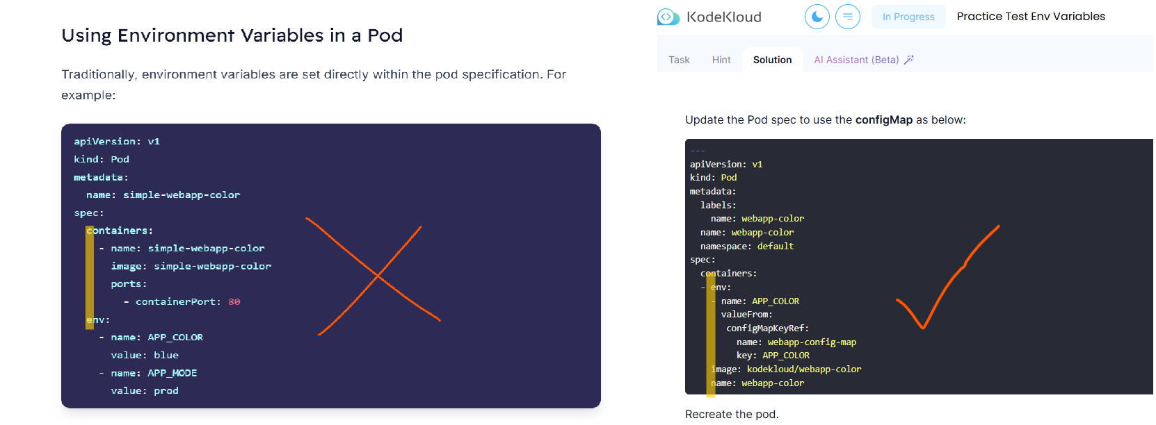 The code shows the env is the child of spec section but however in the labs it is not accepting the shown syntax. the correct syntax is that the env section is the child of containers and it should be aligned in the similar manner to that of containers.name.