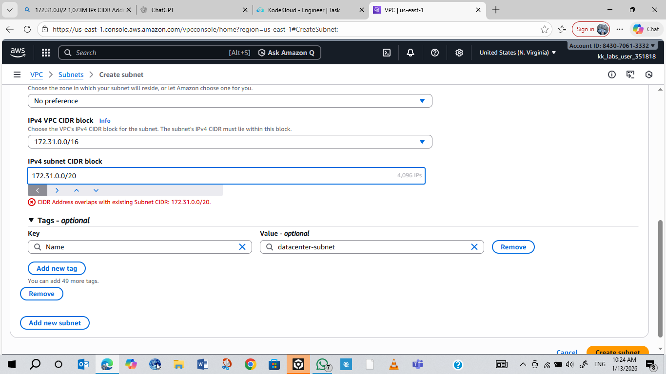 For this lab, create a new subnet with a CIDR that doesn’t overlap with the existing ones. Use the arrow buttons below the CIDR field to cycle through options until you find a valid one.