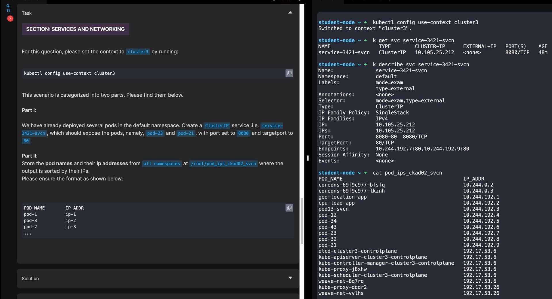 kubectl get po -A -o=custom-columns=‘POD_NAME:metadata.name,IP_ADDR:status.podIP’ --sort-by=.status.podIP > /root/pod_ips_ckad02_svcn
