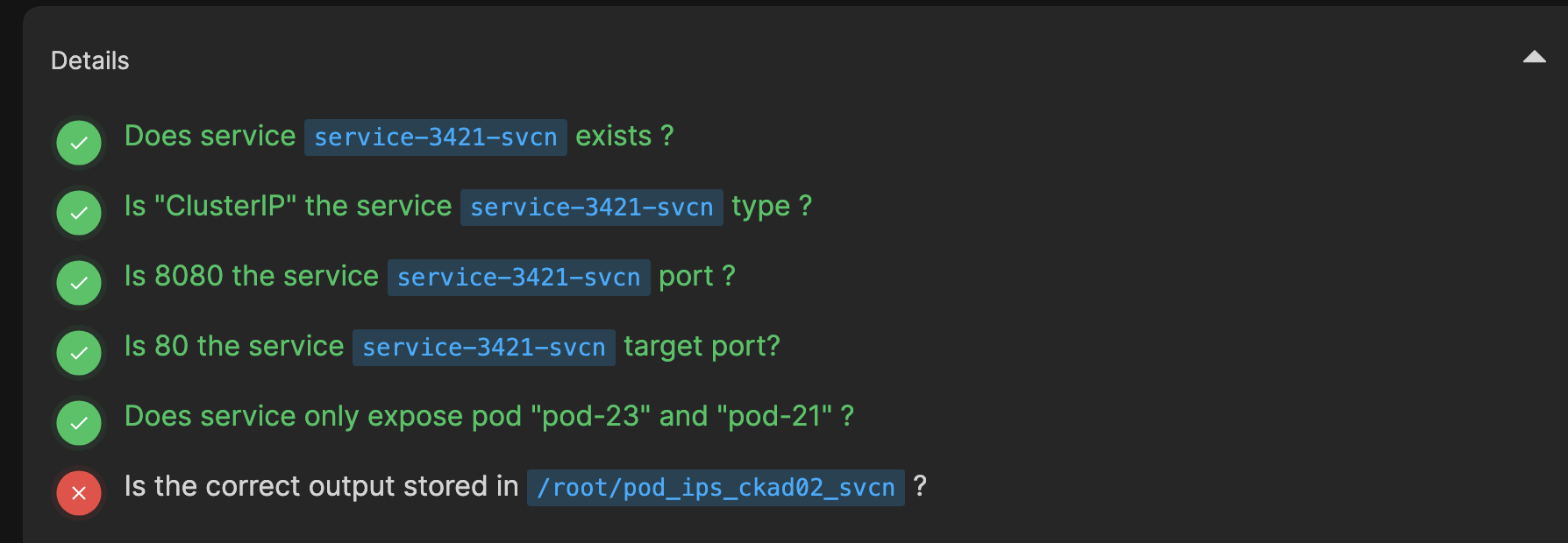 Please find some screenshots showing the service I created and the output of pod_ips_ckad02_svcn.