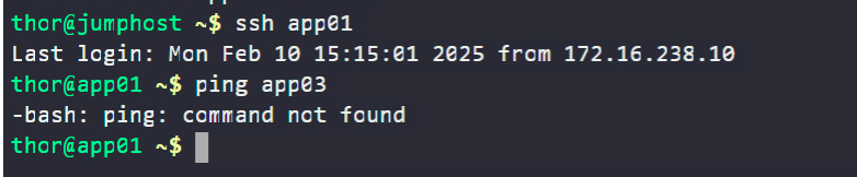 Meanwhile, you can install the iputils package using sudo yum install iputils -y which will install the ping tool. Alternatively, you can try to ssh into app03 or app04 from app01 or app02 to confirm a misconfigured network and complete the lab.