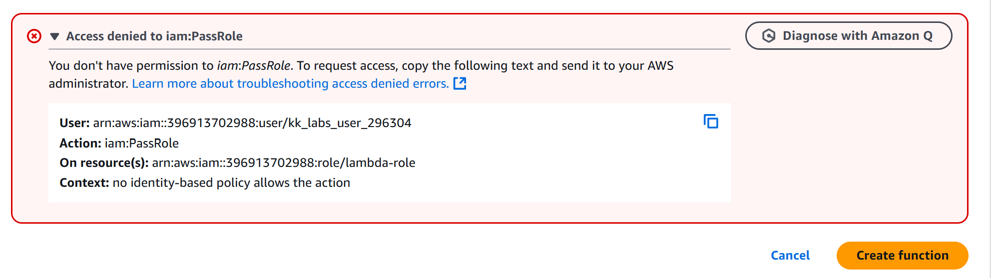 You’re running into a permissions issue with the iam:PassRole action. Make sure your IAM user has the necessary permissions to pass the role you’re trying to use with the Lambda function. You need to talk to your AWS admin to get that sorted out.