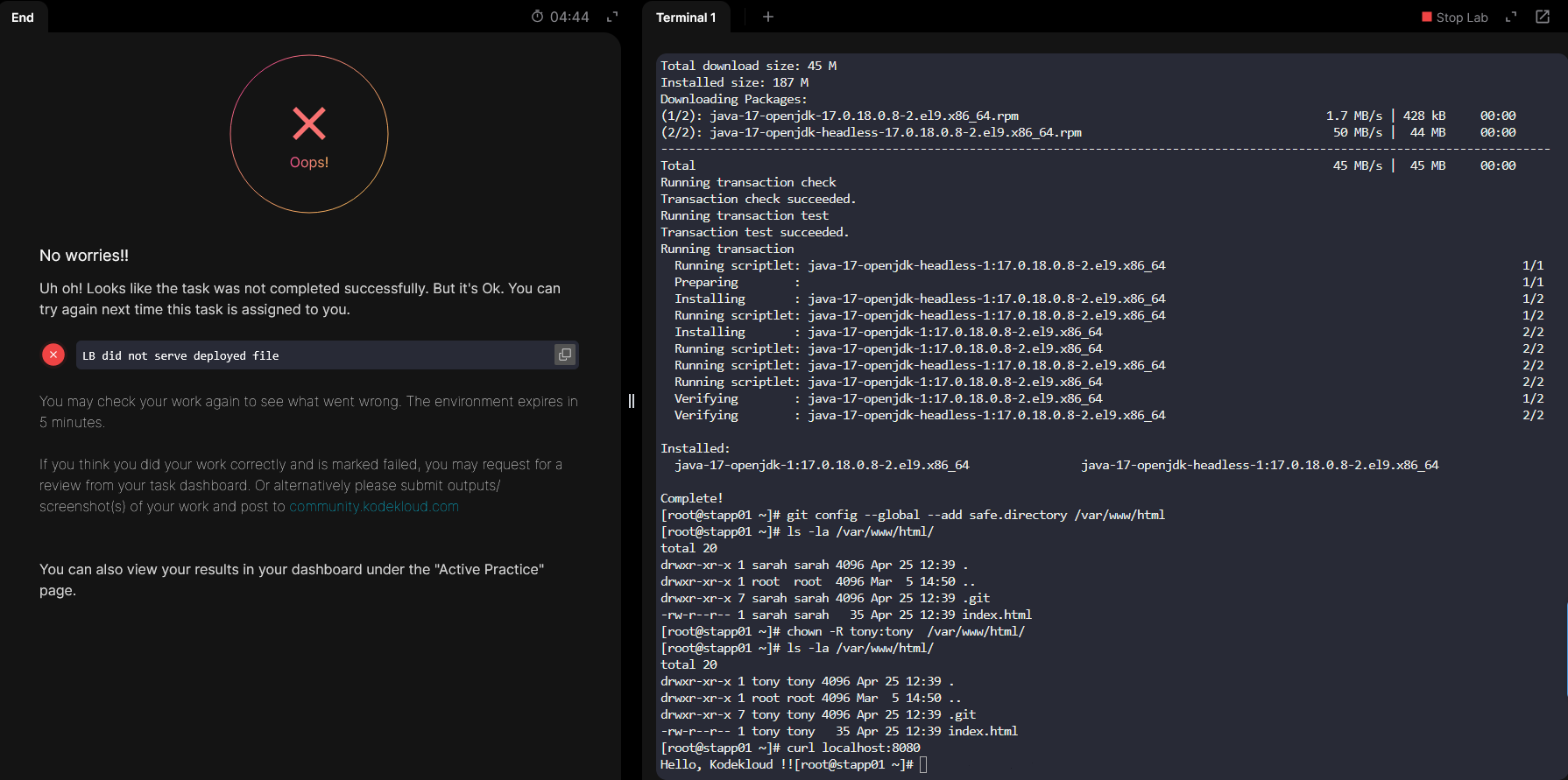 Similarly, click on the Gitea button on the top bar to access the Gitea UI. Login using username sarah and password Sarah_pass123. There under user sarah you will find a repository named web_app that is already cloned on App Server 1 under /var/www/html. sarah is a developer who is working on this repository.