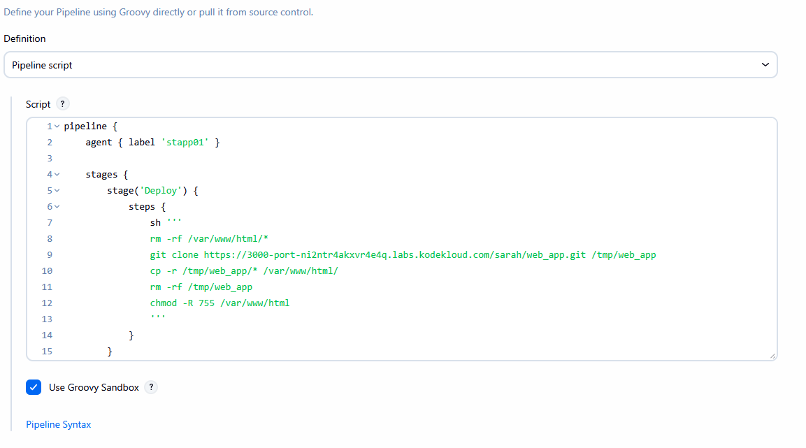 Deploy the code from web_app repository under /var/www/html on App Server 1, as this is the document root of the app server. The pipeline should have a single stage named Deploy ( which is case sensitive ) to accomplish the deployment.
