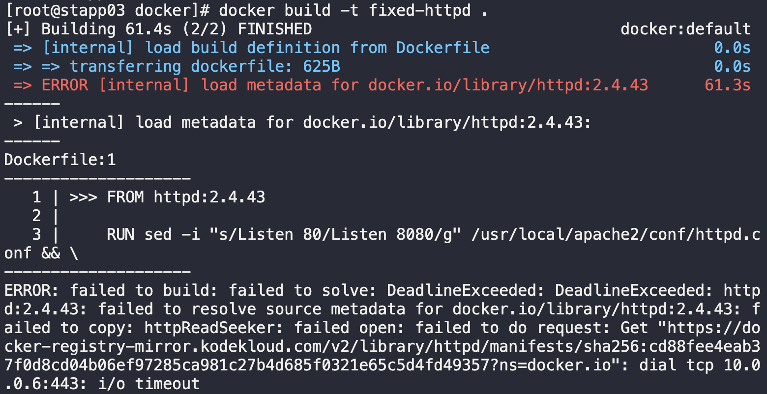 ERROR: failed to solve: DeadlineExceeded: DeadlineExceeded: DeadlineExceeded: httpd:2.4.43: failed to resolve source metadata for Docker Hub Container Image Library | App Containerization failed to copy: httpReadSeeker: failed open: failed to do request: Get “https://docker-registry-mirror.kodekloud.com/v2/library/httpd/manifests/sha256:cd88fee4eab37f0d8cd04b06ef97285ca981c27b4d685f0321e65c5d4fd49357?ns=docker.io”: dial tcp 10.0.0.6:443: i/o timeout