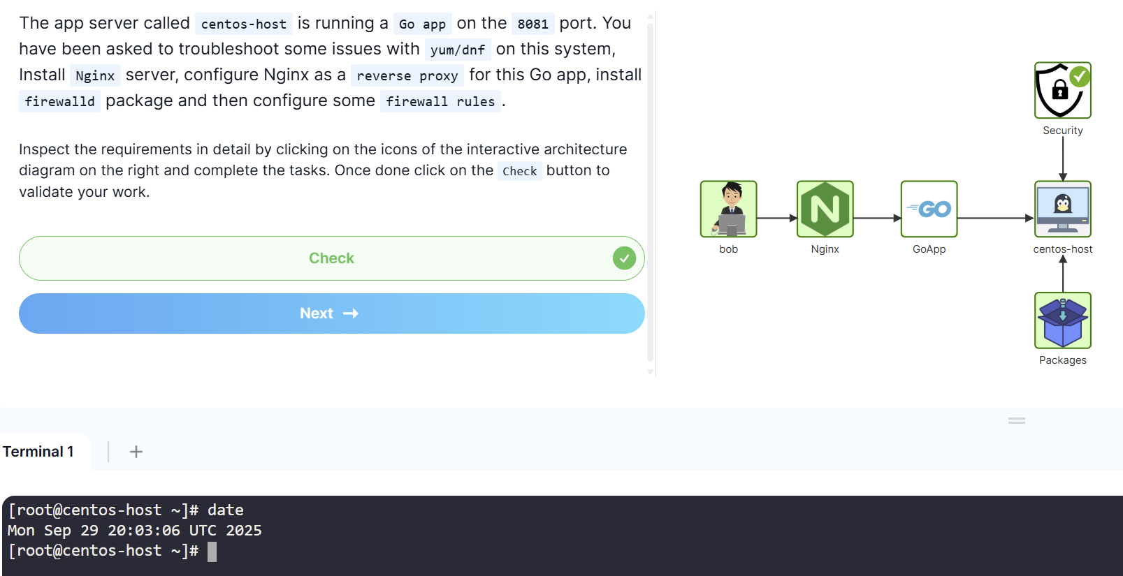 So the second challenge https://learn.kodekloud.com/user/courses/linux-challenges/module/b1104b85-a11a-47b3-a012-8b6a0ea815a8/lesson/a12d6774-3acc-4d78-9744-a7181c0eb361 is having an issue to request intenet in general. I went to /etc/resolv.conf and add the nameservers 8.8.8.8 8.8.4.4 and 1.1.1.1 separted each one by a new line in the file, and the container is unable to get internet properly. When I do sudo dnf update it only updates the first repo, but for the extra repo, the container just stay in waiting and waiting for a respond. I mostly sure this lab is buggy. Please if that’s the case fix it so I can train for my sys admin certification :slight_smile: