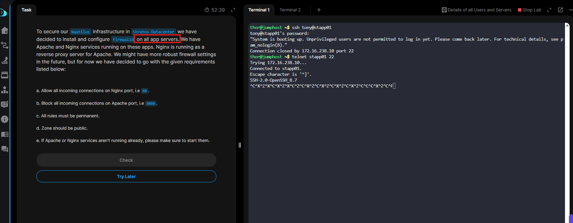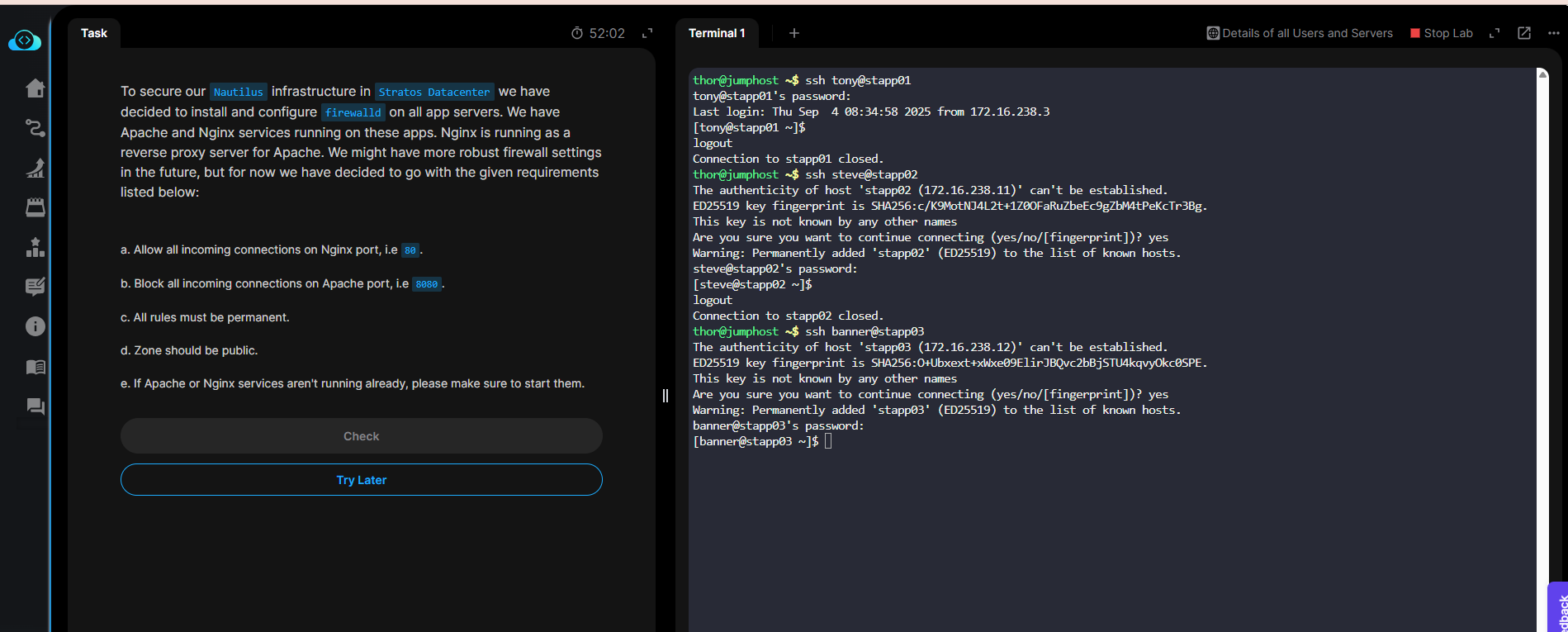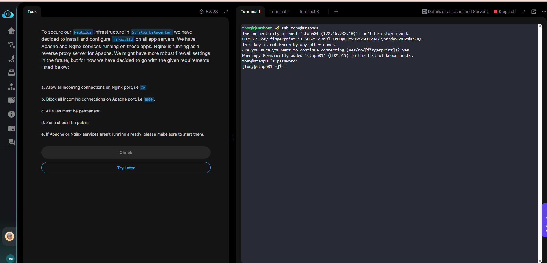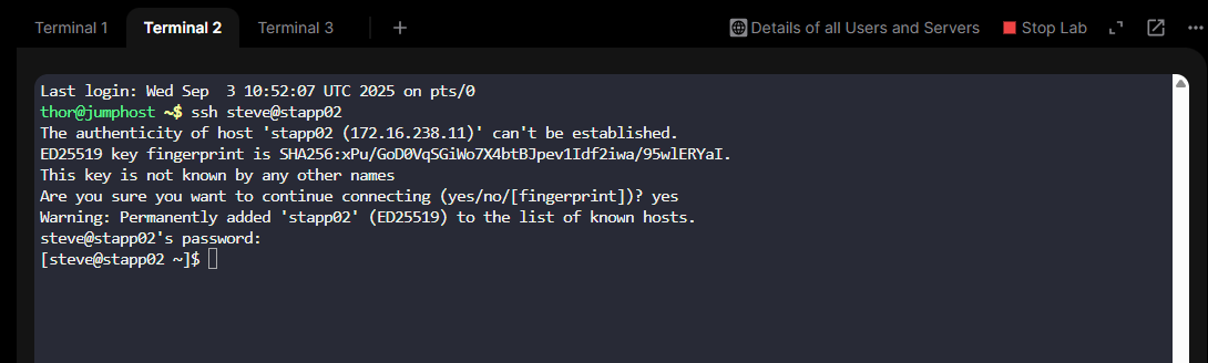I was facing the same issue with this lab yesterday. I’m able to ssh into the app servers now (tried only stapp01), but the terminal is very slow. It’s sometimes taking more than 10 seconds to register the key strokes on the keyboard. Tried thrice and had the same issue.