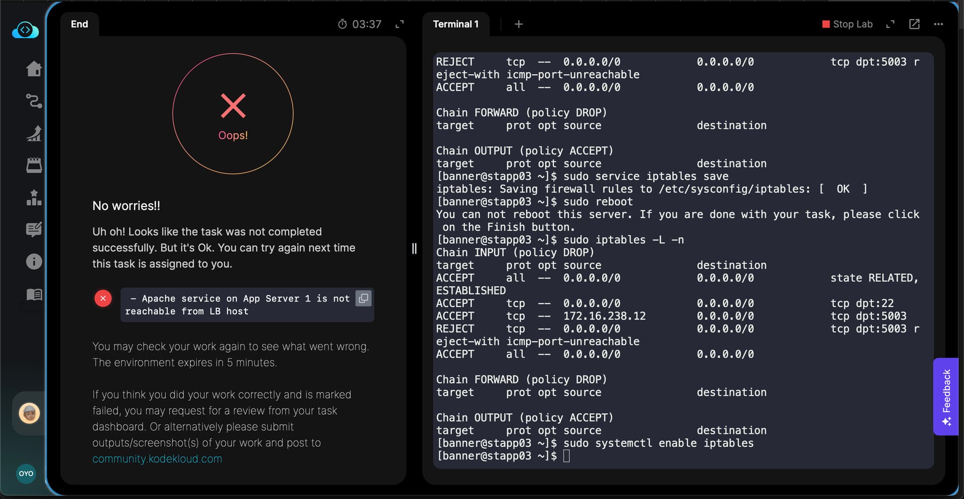 So, for this task if we just use iptables and no custom script or systemd service to load the saved rules on reboot, ideally the validation should fail, but that’s not the case; which is why I’m wondering if there is some issue with validation. (Thinking out loud… maybe rebooting the app servers is not possible and this is just a work-around)