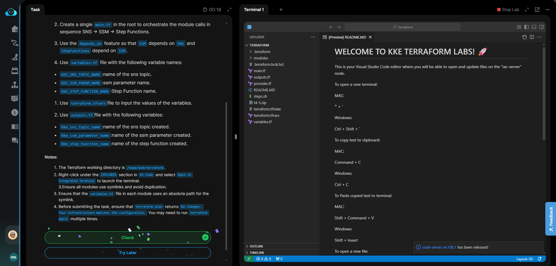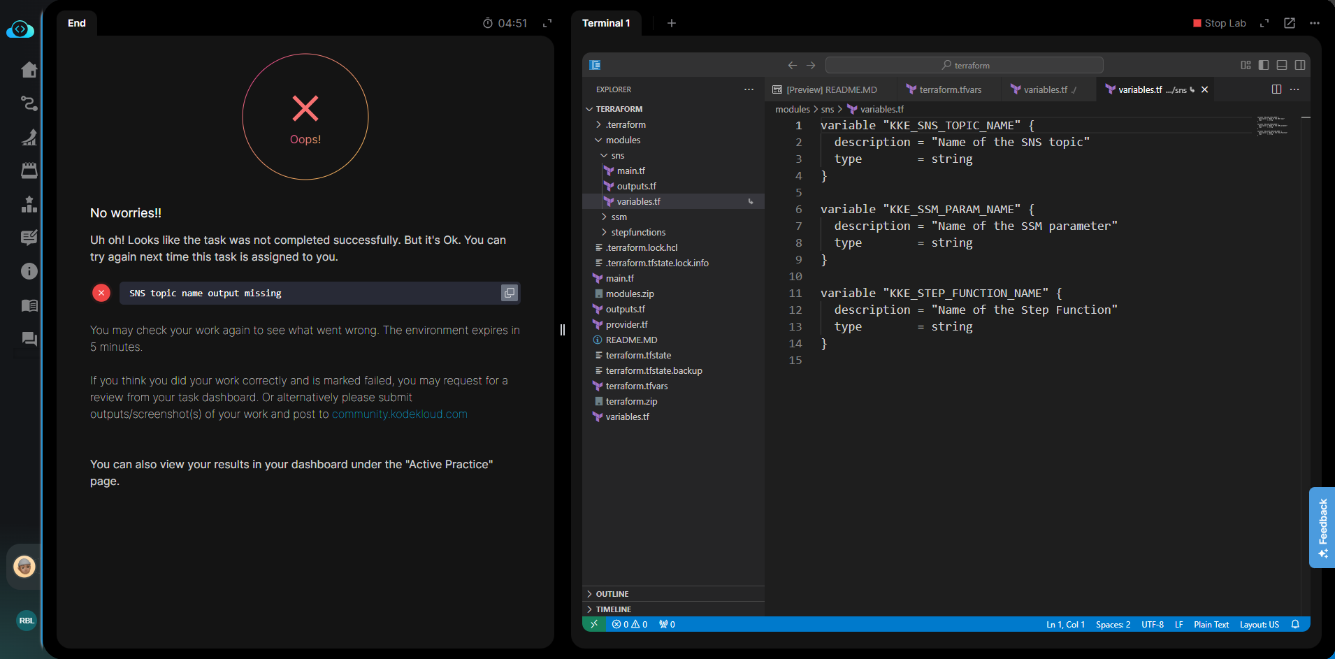 I recently completed the “Managing Terraform Code with Symlinks” task, but it was marked as failed due to the output “ SNS topic name output missing”. I cross checked. I belive everything was executed correctly. Attached Screenshot for reference. Kindly review and let me know if there’s anything I may have missed.
