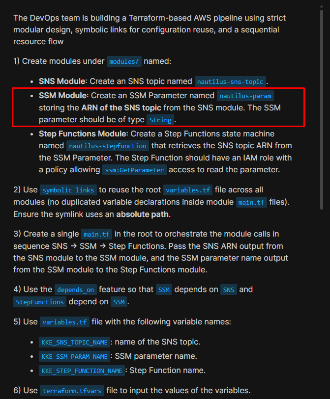 The task asks to create an SSM parameter that stores the ARN of the SNS topic from the SNS module. Please make sure this is done correctly.