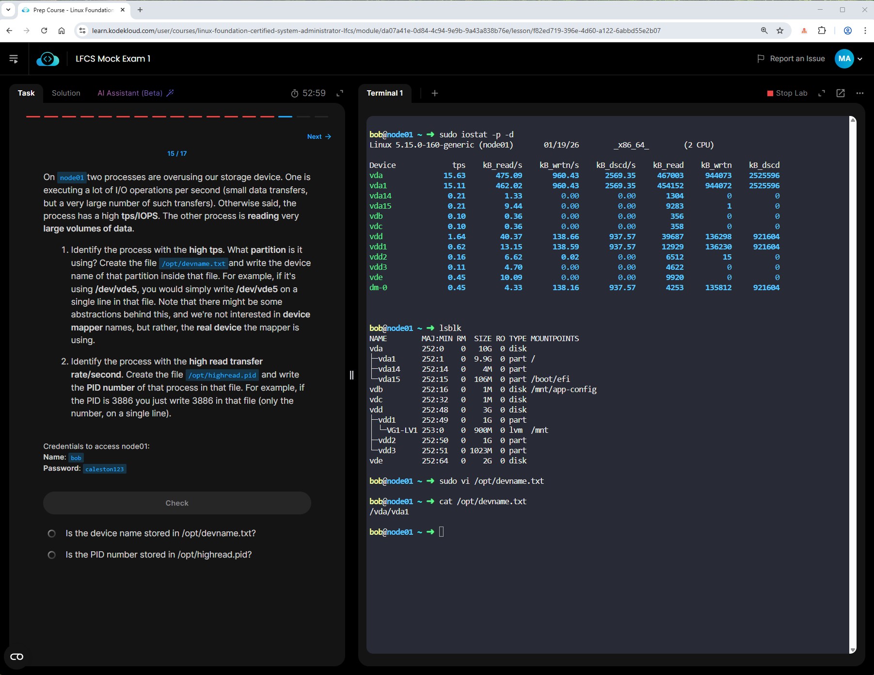 Hi, i used ’ iostat -p -d’ to get the high tps and the device is /dev/vda1 which the lab is showing incorrect