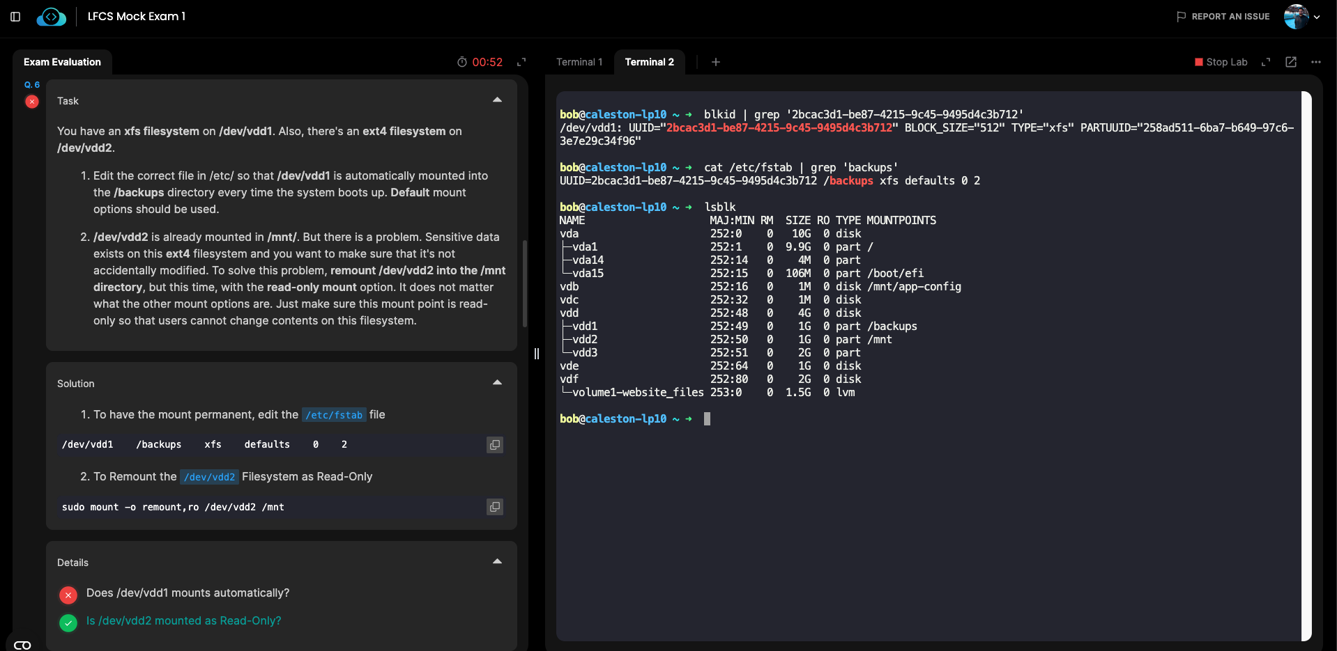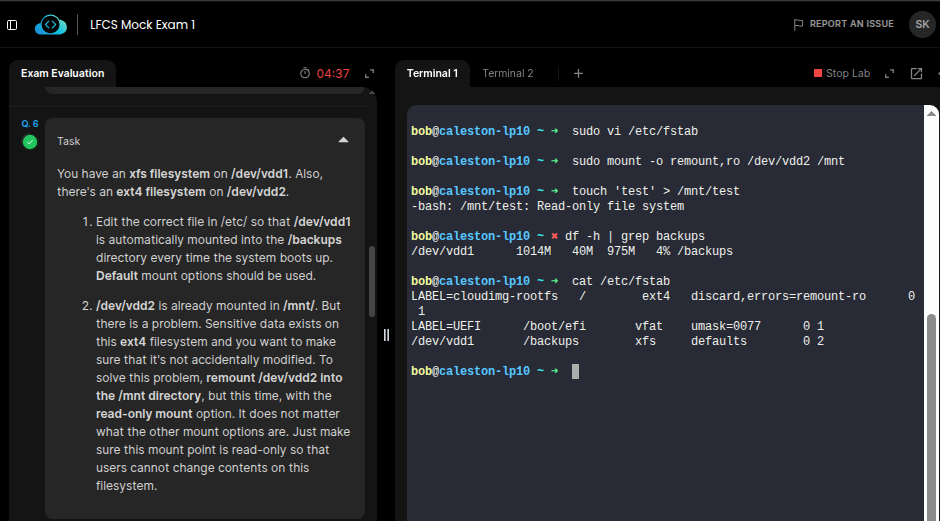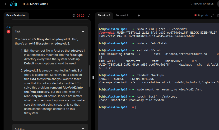 Probably, the grader is specifically looking for the device name instead of the UUID in the /etc/fstab.