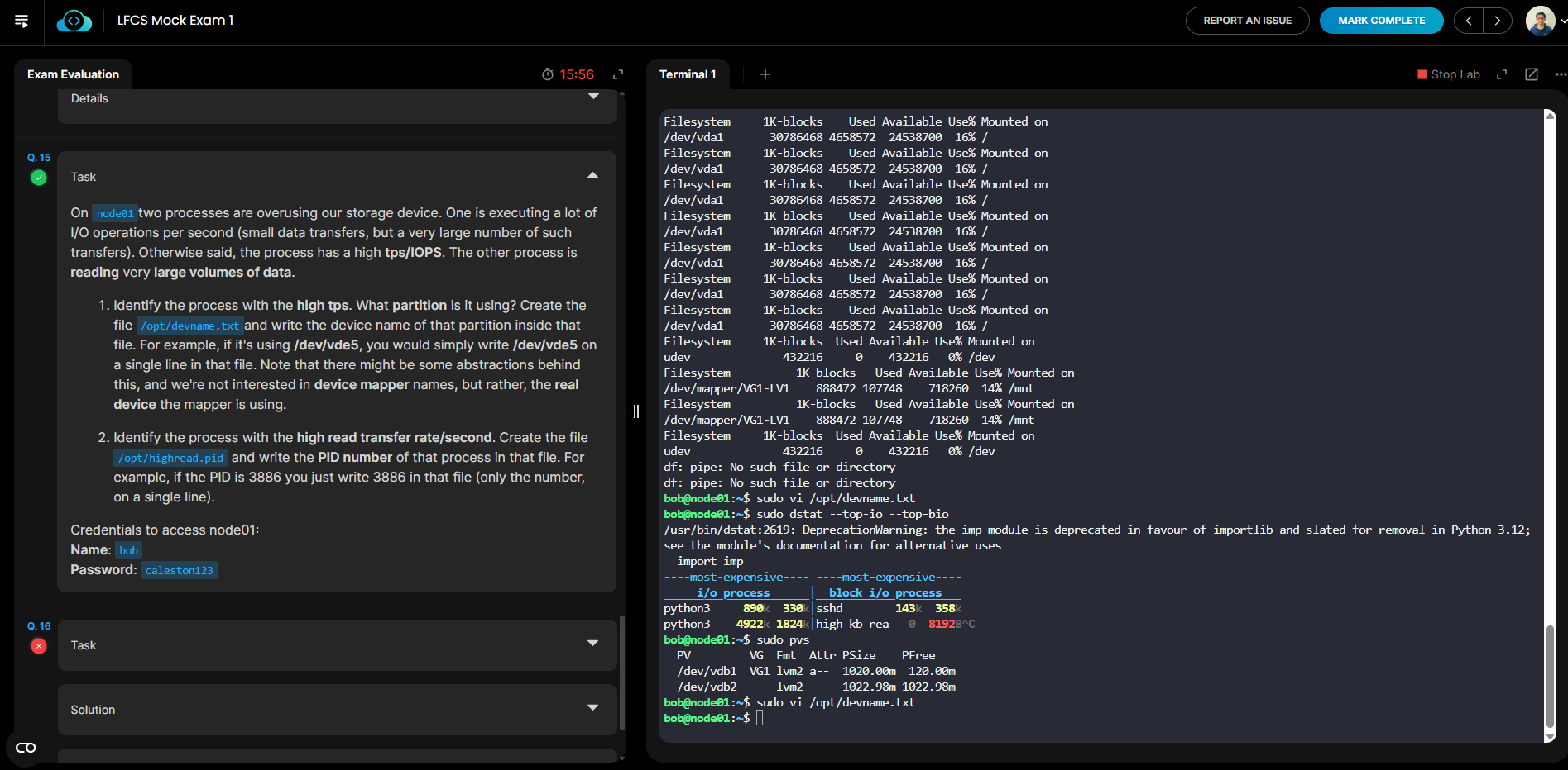 I’ve confirmed the question works correctly on my end. You need to follow the command line steps in the solution to identify the process with the high TPS and the process with the high read transfer rate per second, then write the answers to the text files. Please let me know if you have any other questions.
