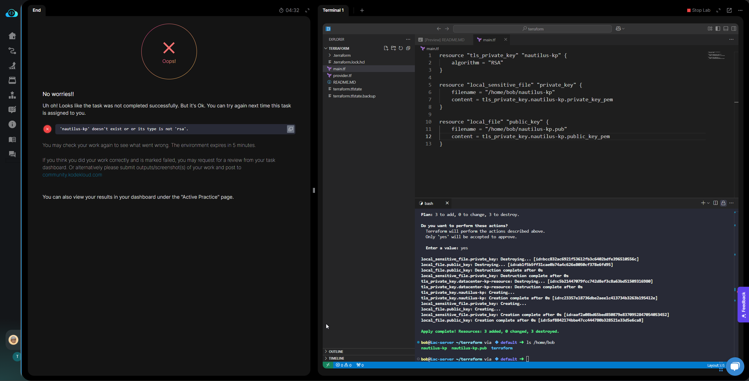 I have completed Create Key Pair Using terraform activity. But, the validation of this task is failing even though the output files are present. PFA for reference