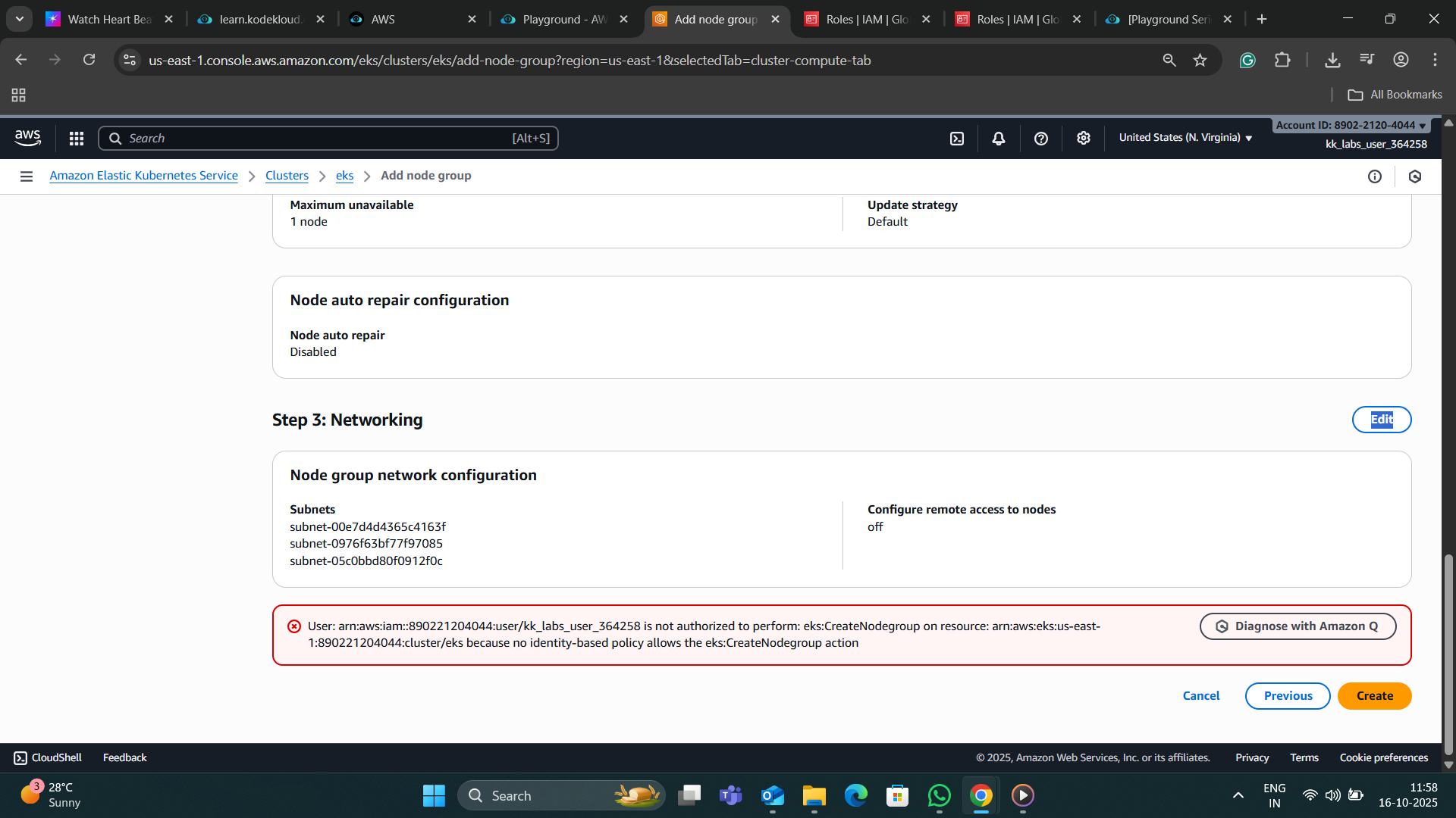 User: arn:aws:iam::890221204044:user/kk_labs_user_364258 is not authorized to perform: eks:CreateNodegroup on resource: arn:aws:eks:us-east-1:890221204044:cluster/eks because no identity-based policy allows the eks:CreateNodegroup action