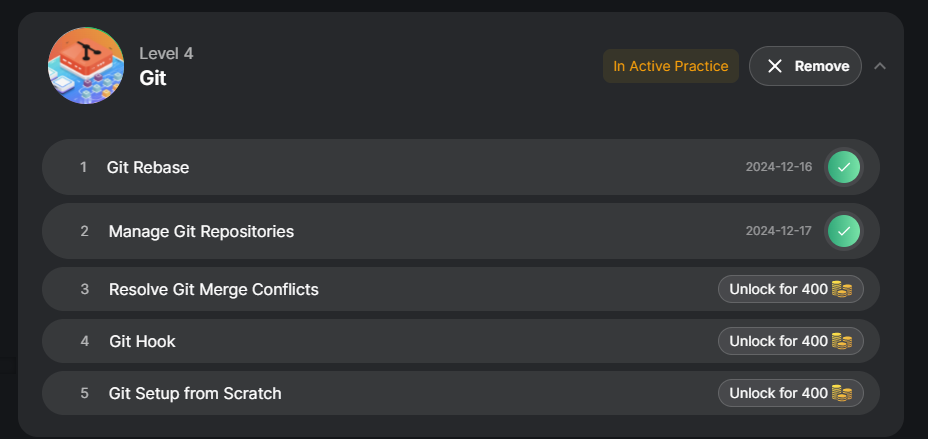 I am not able top get my task unlock for free for GIT level 4, I was able to open it for first two. As in 24 hours we used to get 1 task from active practice but this one is not getting unlocked.