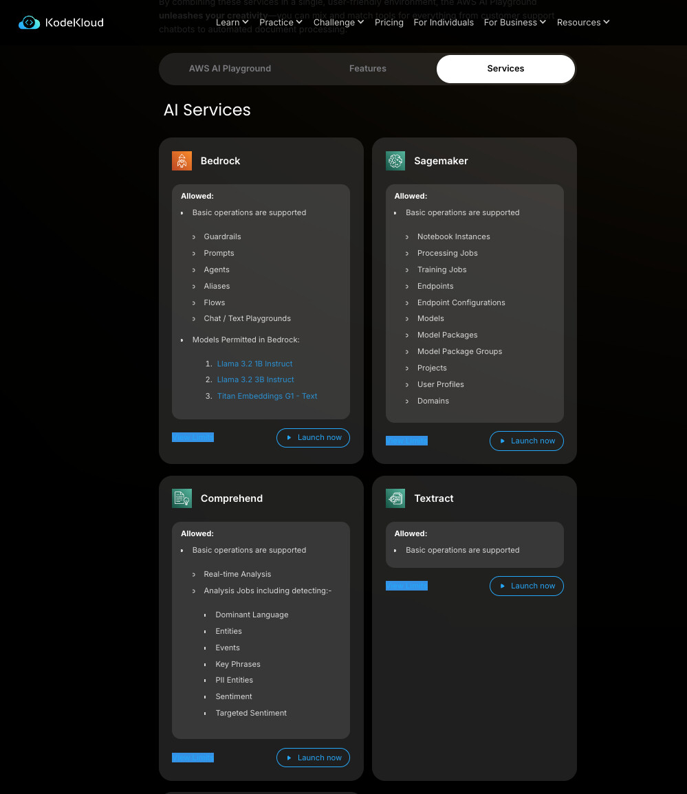 @rob_kodekloud / @TanishkaMarrott, relatedly, I am not able to use models permitted under Services on AWS AI Playground | KodeKloud