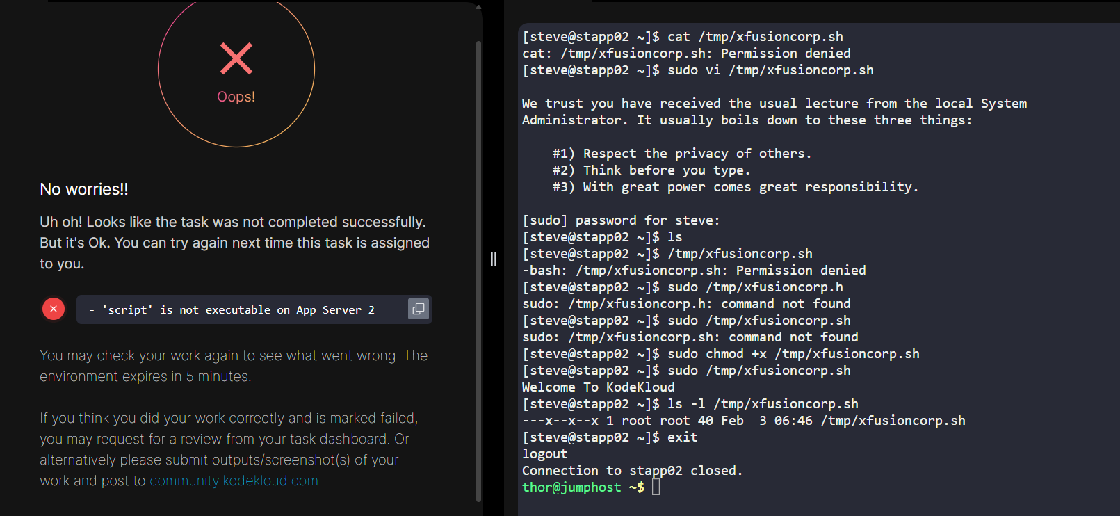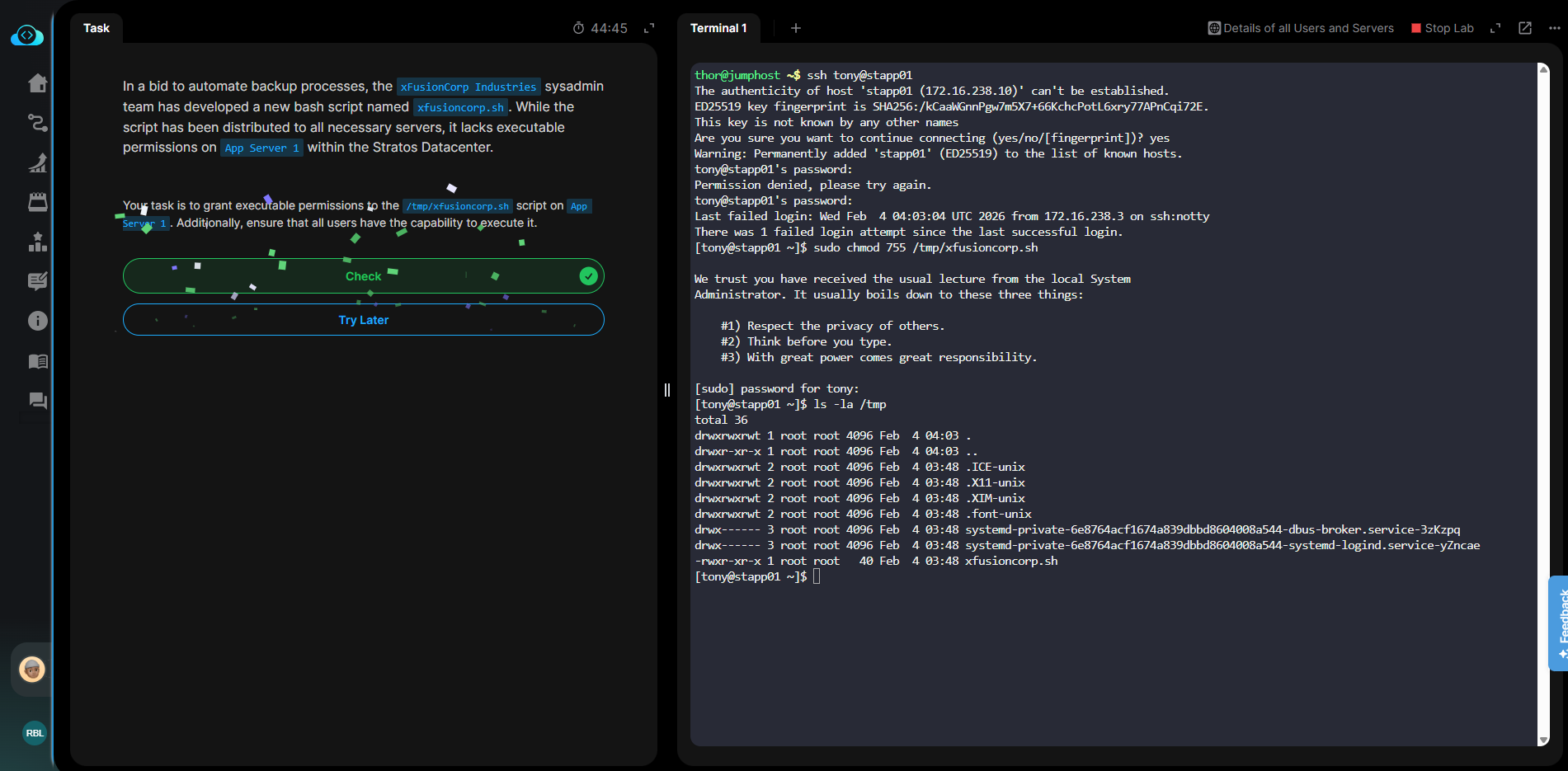 task was to change the bash script file permission on app server 2 , so that it can be executed by every user. I just added the +x (executable permission) on the script file. but its not getting accepted