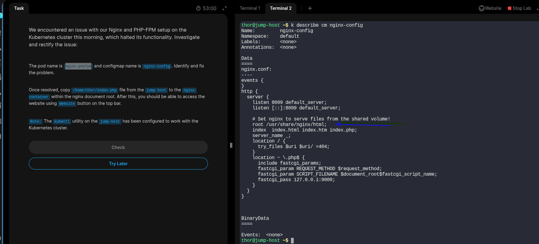 I followed the solution exactly but getting the below nginx screen instead php. Should I update the php container volume mount path to nginx one