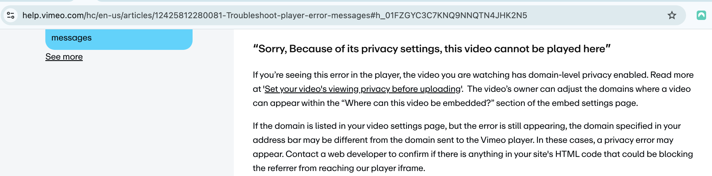 - If that fails, since we use the Vimeo engine to host our videos, please take a look at their troubleshooting guide. Usually it will give you some way to work around this.