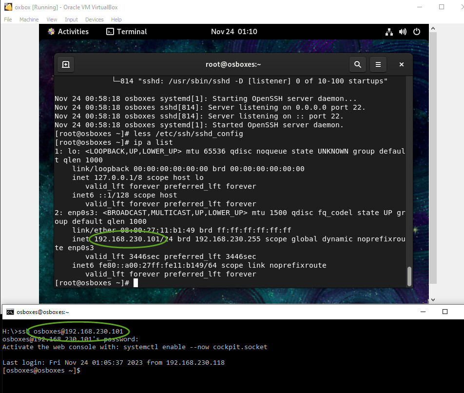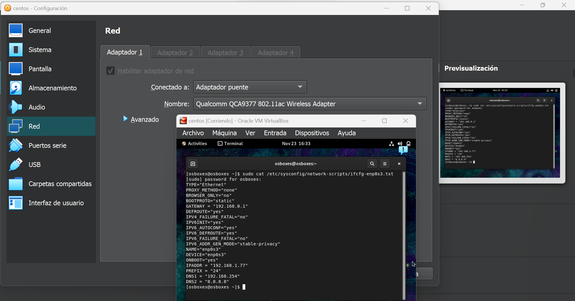 I did connect the networking as described in the video, I used port 22 because MobaXterm use port 22 as default. At firts I could’t connect to the internet, when I was searching a solution I saw that there was no ifcfg-enp03 file in my network-scripts, so i configured one manually, as you can see in the ss.