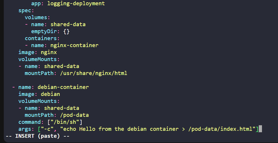 i kept exactly were i was supposed to keep but after doing set paste also name of conatiner is pasted properly but the image and all below that the indentation is not properly pasted and i used shift+v selected below from image till end and did shift+> and bought it to alignment and after that i did k apply -f file.yaml it gave me error no proper indentation
