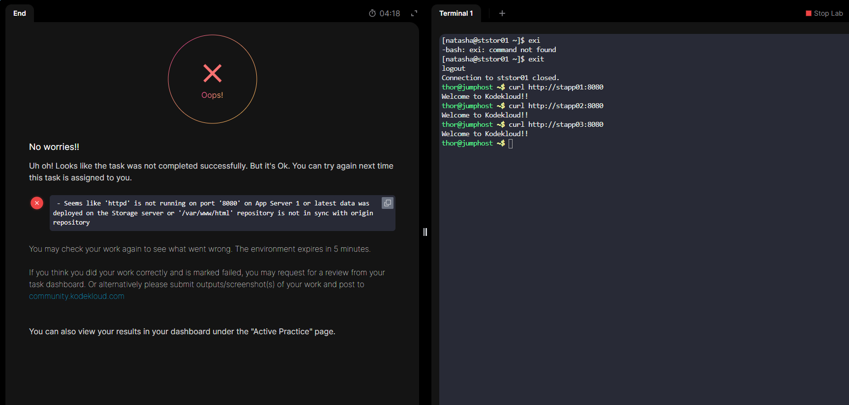 Hey everyone! I’m currently stuck at Day 79 despite different solutions. I think my solution works. The App site changes whenever the repo changes. It says that I don’t have port 8080 listening on App Server 1 or latest changes in the repo is not in sync with storage server but I have all these working. If anyone could point me in a right direction, I’d appreciate it. Please see the attached pictures for proof. I already have several attempts.