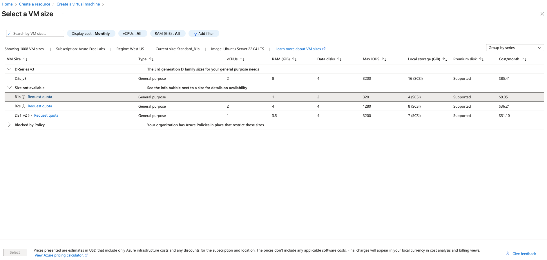 I’m not sure what happened in your case. I tried this exercise, and you have to do an extra click to get the B1 size, but I was able to do so. When I created the vm, this is the data I got: