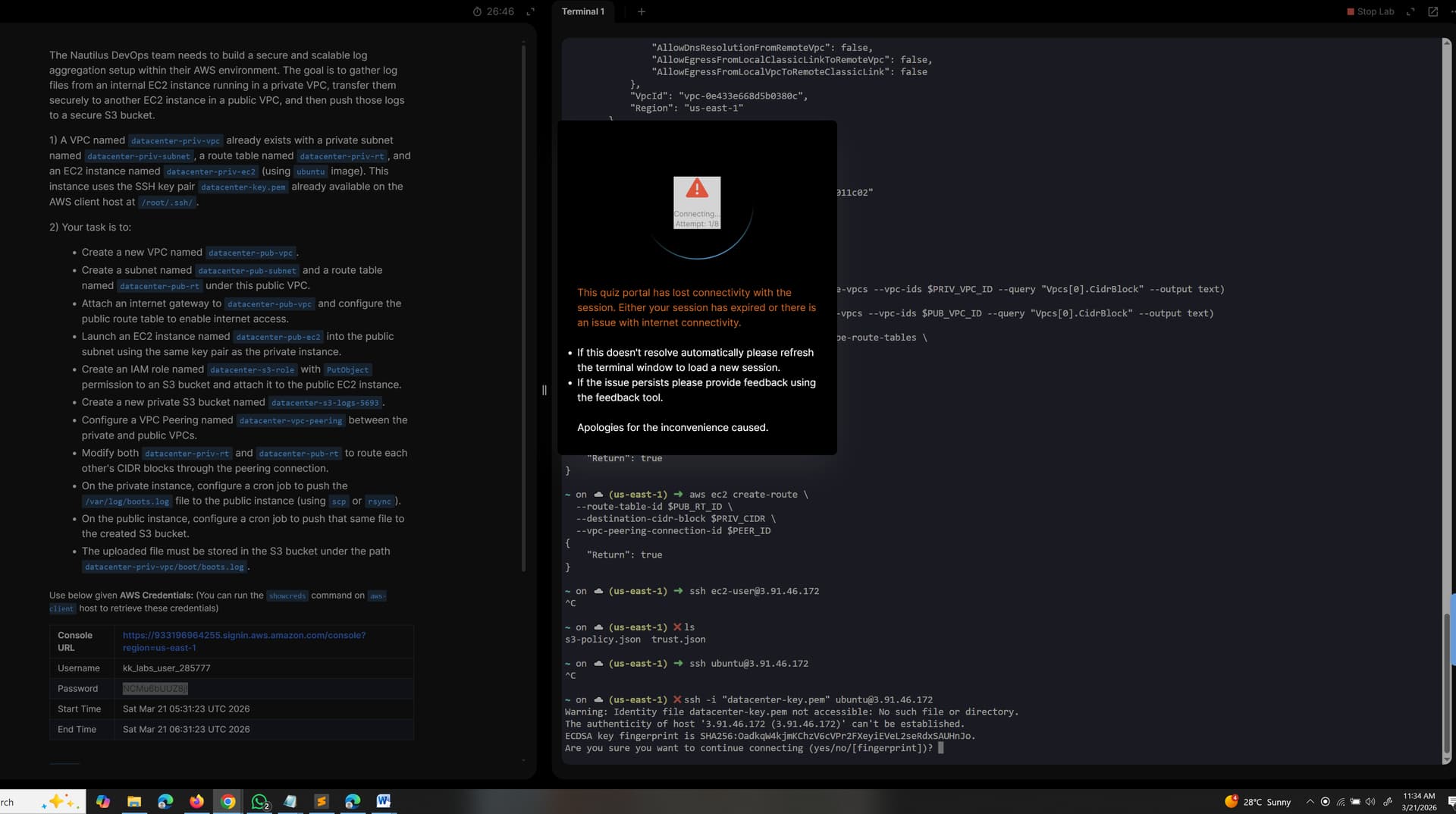 This is usually caused by somethng at your end or close to it. Please try the lab again, perhaps from a place with more reliable internet service.