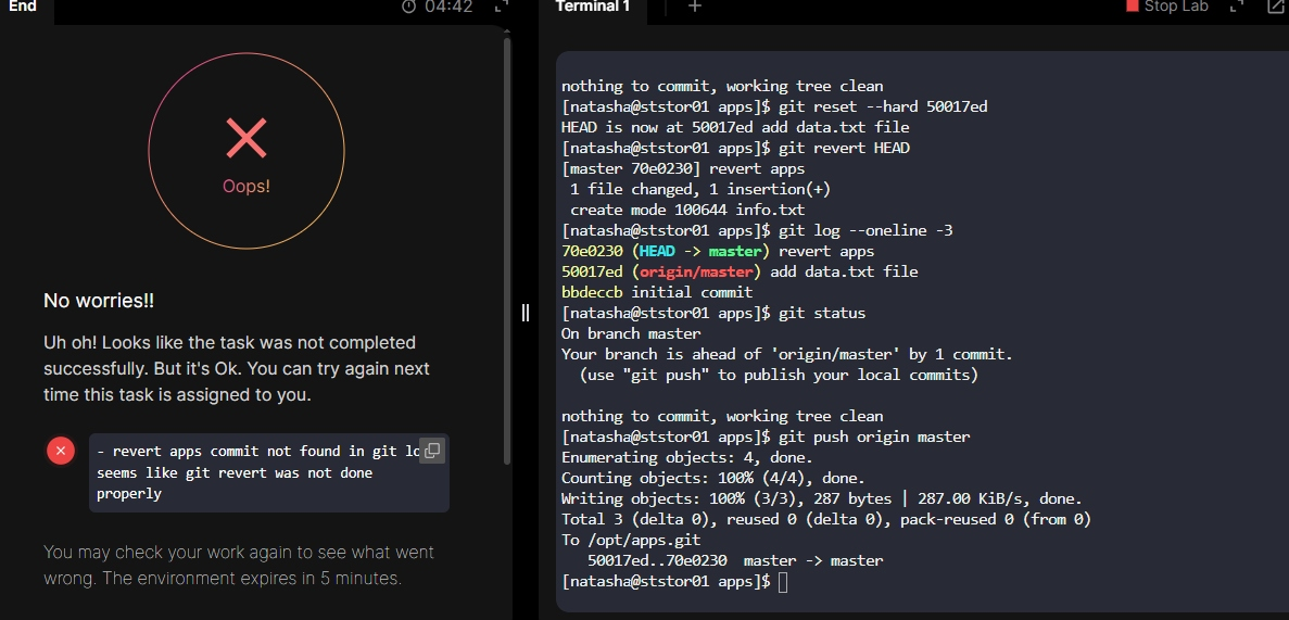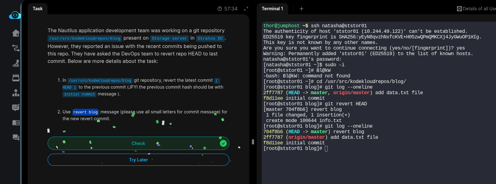 thor@jumphost ~$ ssh natasha@ststor01 The authenticity of host ‘ststor01 (10.244.30.54)’ can’t be established. ED25519 key fingerprint is SHA256:yEyN8qvzhNxfcKVE+H05zwQPmQMKCXj4JyGWuOP1HIg. This key is not known by any other names. Are you sure you want to continue connecting (yes/no/[fingerprint])? yes Warning: Permanently added ‘ststor01’ (ED25519) to the list of known hosts. natasha@ststor01’s password: [natasha@ststor01 ~]$ cd /usr/src/kodekloudrepos/apps [natasha@ststor01 apps]$ git config --global --add safe.directory /usr/src/kodekloudrepos/apps [natasha@ststor01 apps]$ sudo chown -R natasha:natasha /usr/src/kodekloudrepos/apps /opt/apps.git [natasha@ststor01 apps]$ git config user.name “natasha” [natasha@ststor01 apps]$ git config user.email “natasha@example.com” [natasha@ststor01 apps]$ git reset --hard HEAD is now at 50017ed add data.txt file [natasha@ststor01 apps]$ git clean -fd Removing apps.txt [natasha@ststor01 apps]$ git revert HEAD [master 4980dfc] Revert “add data.txt file” 1 file changed, 1 insertion(+) create mode 100644 info.txt [natasha@ststor01 apps]$ git revert HEAD [master 4e6aa07] revert apps 1 file changed, 1 deletion(-) delete mode 100644 info.txt [natasha@ststor01 apps]$ git log --oneline -3 4e6aa07 (HEAD → master) revert apps 4980dfc Revert “add data.txt file” 50017ed (origin/master) add data.txt file [natasha@ststor01 apps]$ git status On branch master Your branch is ahead of ‘origin/master’ by 2 commits. (use “git push” to publish your local commits) nothing to commit, working tree clean [natasha@ststor01 apps]$ git reset --hard 50017ed HEAD is now at 50017ed add data.txt file [natasha@ststor01 apps]$ git revert HEAD [master 70e0230] revert apps 1 file changed, 1 insertion(+) create mode 100644 info.txt [natasha@ststor01 apps]$ git log --oneline -3 70e0230 (HEAD → master) revert apps 50017ed (origin/master) add data.txt file bbdeccb initial commit [natasha@ststor01 apps]$ git status On branch master Your branch is ahead of ‘origin/master’ by 1 commit. (use “git push” to publish your local commits) nothing to commit, working tree clean [natasha@ststor01 apps]$ git push origin master Enumerating objects: 4, done. Counting objects: 100% (4/4), done. Writing objects: 100% (3/3), 287 bytes | 287.00 KiB/s, done. Total 3 (delta 0), reused 0 (delta 0), pack-reused 0 (from 0) To /opt/apps.git 50017ed…70e0230 master → master