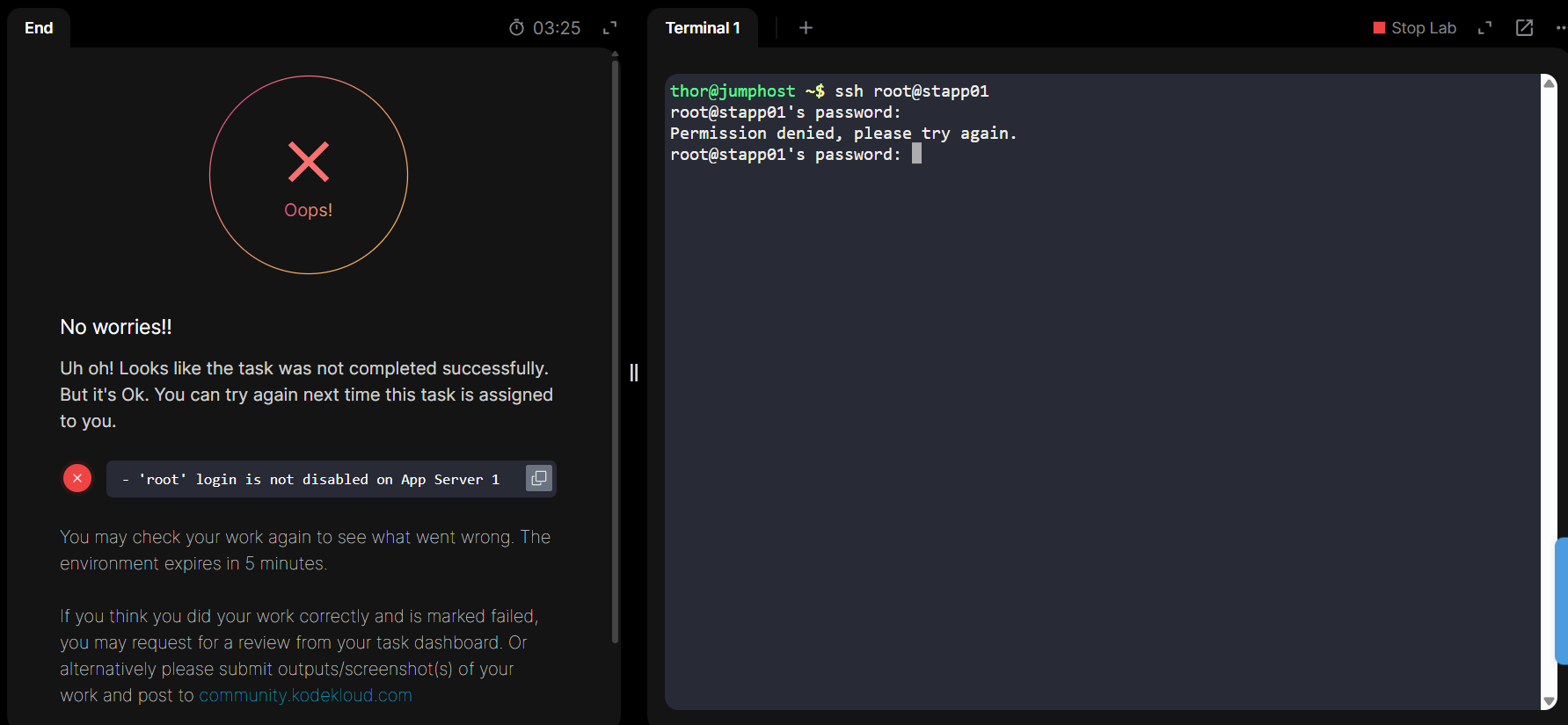 I have disabled the direct Root login , on all the app server (there are three app servers named , stapp01, stapp02, stapp03) , but after submitting the task. its says . it was not disabled on server 1, as you can see in the attached screenshot … permission to root user is denied.