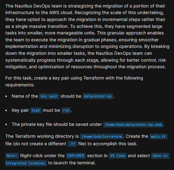 Could I please see the wording of the question? The terraform works to create a file /home/bob/datacenter-kp.pem. It sounds like the grader script does NOT expect that file name. So the question may clarify why that is.