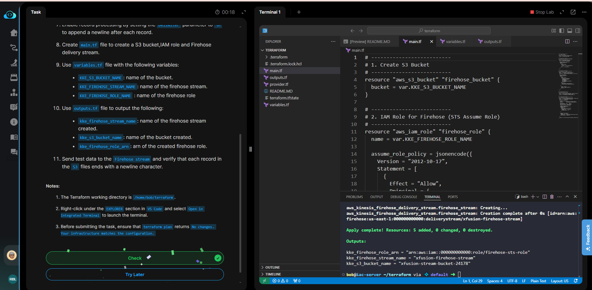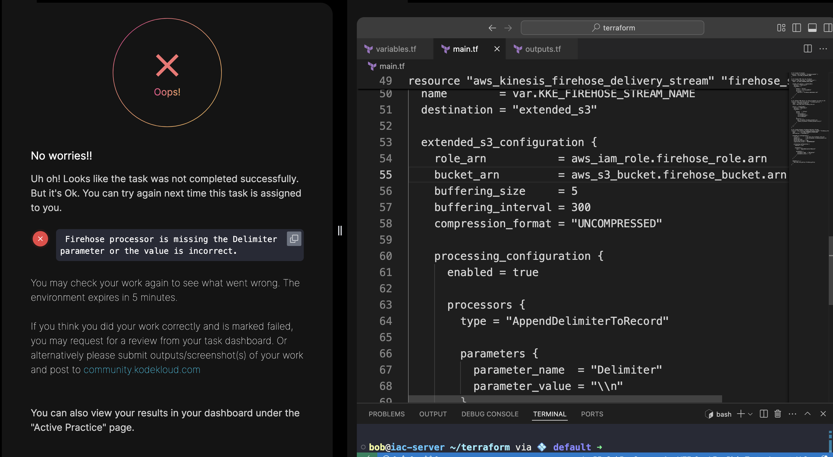 @raymond.baoly Although, there is only a need of main.tf file here to examine , as the error on page shows “Firehose processor is missing the Delimiter” , as I mentioned that outputs file working fine and I am getting the expected output, but the task is failing with "Firehose processor is missing the Delimiter