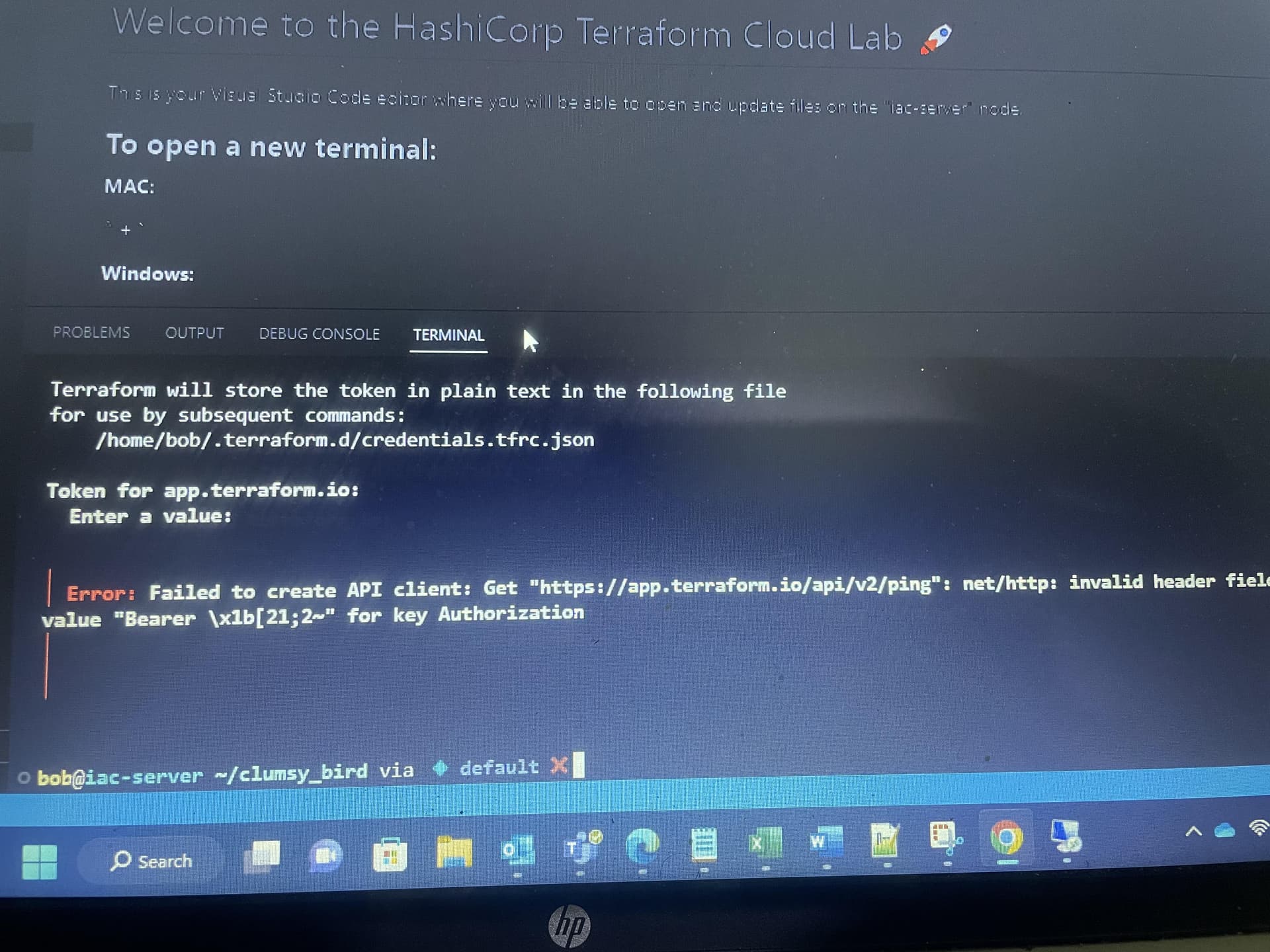 I have created an account to access terraform cloud labs but while login to terraform cloud using “terraform login” command and using token getting attach error. Please suggest.