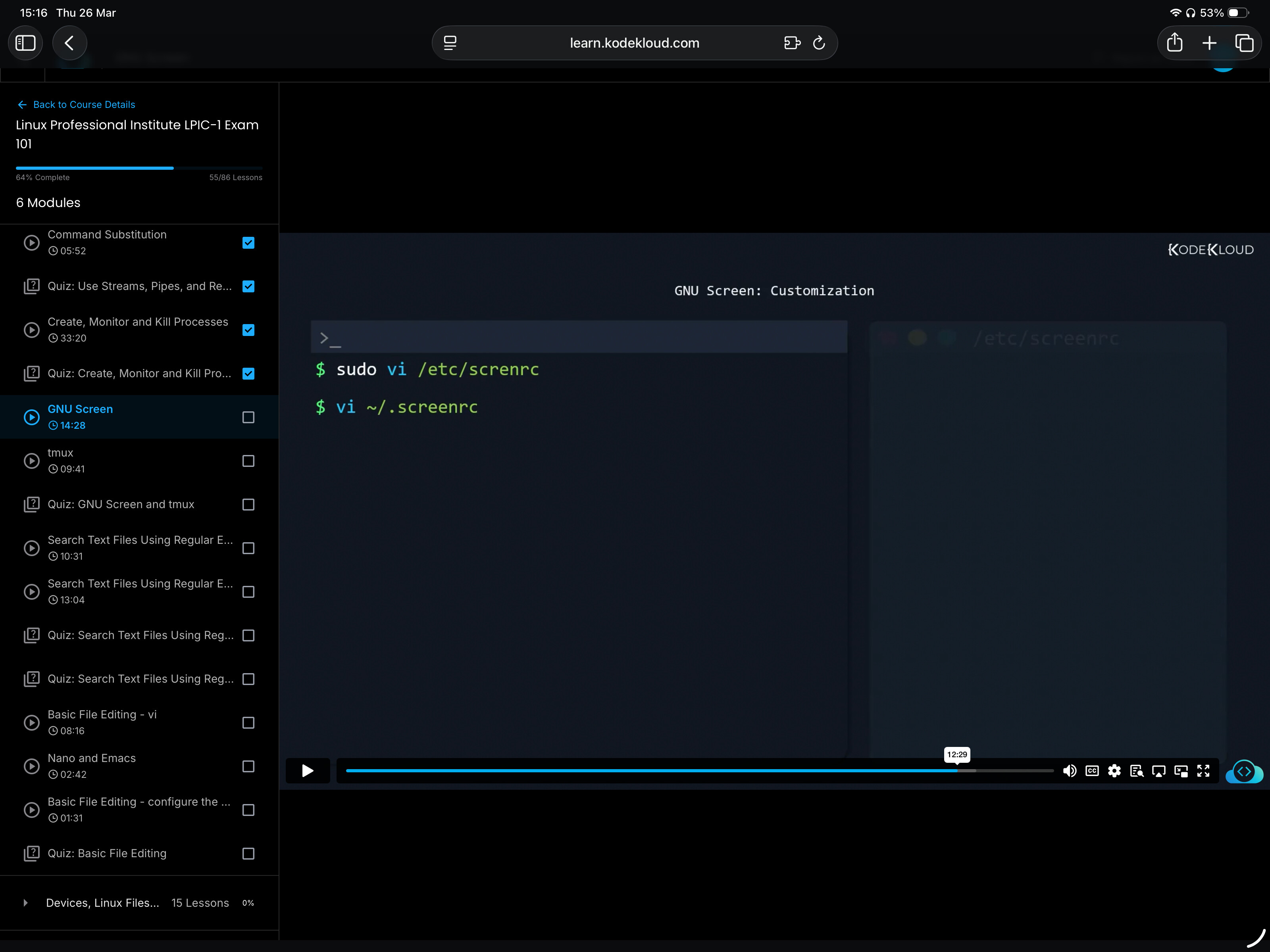 At approximately 12:29, the command shown on screen is sudo vi /etc/screnrc, which appears to be incorrect. The correct filename should be screenrc (e.g., /etc/screenrc). This typo also appears in the accompanying PDF.