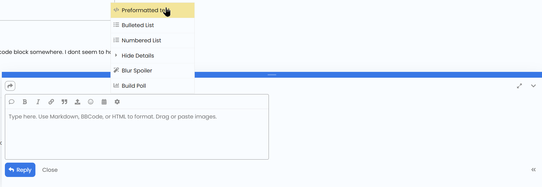 I might be blind but I don’t see the </> in my toolbar. I surrounded the above yaml in ``` which seems to have done what you want?