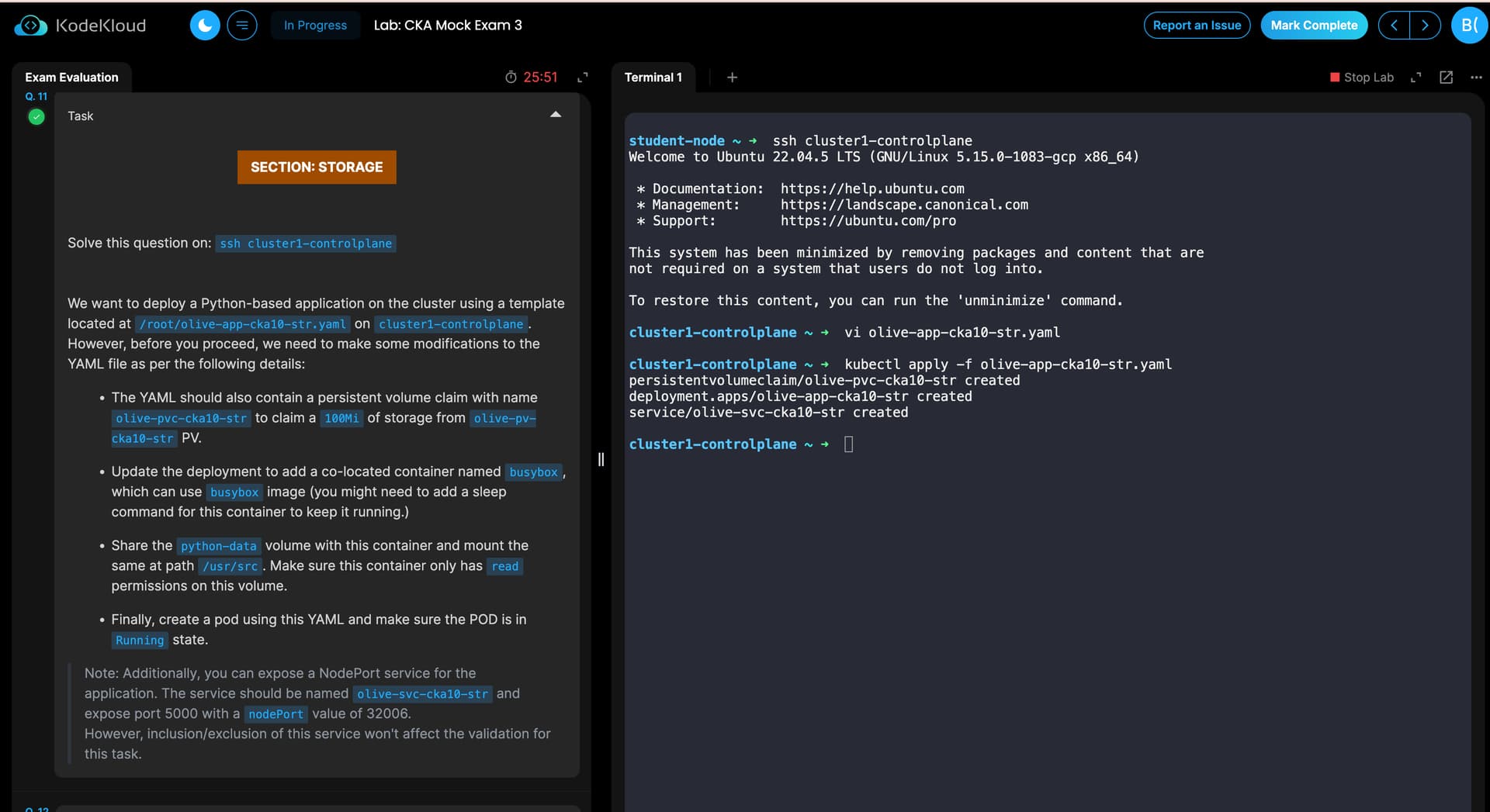 I also checked the the pods were running, pvcs were bound, etc… after applying. However my answer was marked wrong. Any ideas as to why? Thanks!