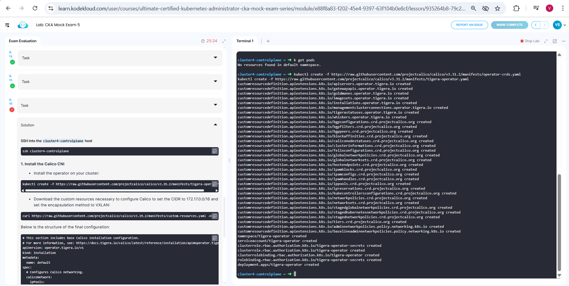 This happened twice for me in the 2 exams , so I suspect the Git/source URL provided in the exam may have been incorrect. Am I missing any steps while configuring the Calico CNI in the exam? The documentation shows two CRD files to download, but in the exam only one URL was provided.